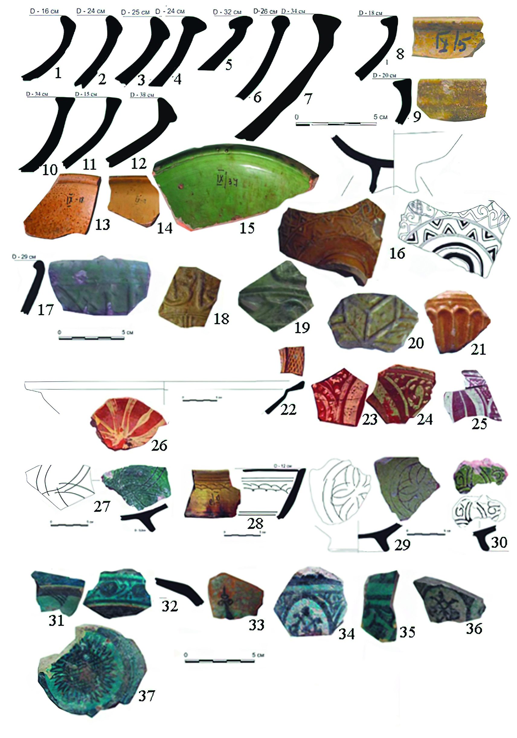 Поливная посуда представлена широким спектром как красноглиняных, так и бежевоглиняных сосудов, среди которых самую большую группу составляют простые бежевоглиняные чаши с округлым или коническим туловом с разнообразными венчиками (ил. 10, 1–15). Поверхность таких сосудов обычно покрыта свинцовой одноцветной поливой, в основном зелёной или жёлтой, наложенной на слой светлого ангоба. Внутренняя и внешняя поверхности некоторых сосудов покрыты поливой разных цветов.