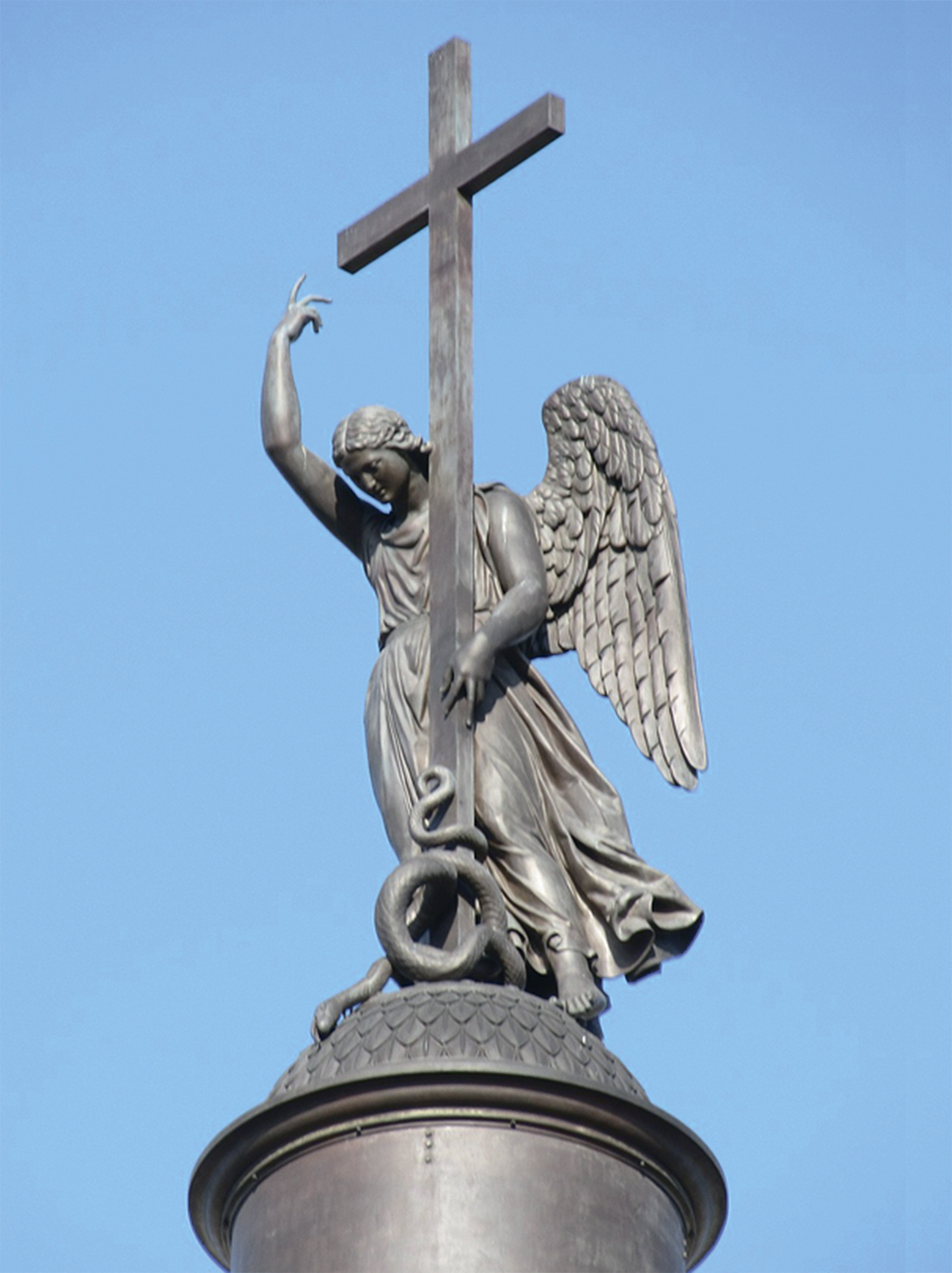 Однако же, помимо общей идеи состязательности, победительности, которая не может так или иначе не проступать у любого поэта, вздумавшего парафрастически передавать Горация, заявлявшего о своём превосходстве над другими, чрезвычайно важна александрийская звуковая оболочка («состязание» двух Александров): ведь как Александрийская колонна в 1834 г. отсылала зрителя к русским победам 1812 г., так введённое Пушкиным слово «Александрийского», вторгаясь в горацианский тематический комплекс, становилось последним, завершающим отзвуком александрийского стиха, которым написаны предыдущие тексты Каменностровского цикла; как колонна на Дворцовой площади, будучи самым большим в мире цельным продуктом из розового гранита, увенчалась фигурой ангела с крестом (ил. 4), так и пушкинский цикл, написанный александрийским стихом, увенчивает произведение уже другой ритмической природы (но с отсылкой к прежнему метру).
