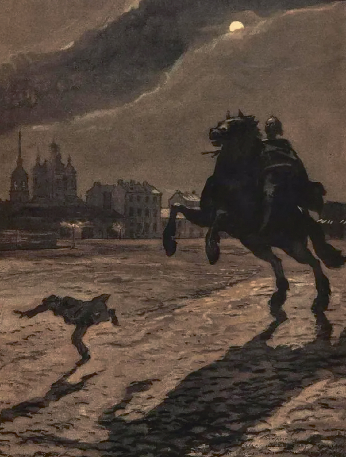 Пётр и его последователи создали на месте блеклой и серой жизни чухонца на берегах пустынных волн пышную и многоцветную державную жизнь. Однако при этом самодержавная государственность не избавила от одноцветности серого существования маленького человека, наполнила его сердце «чёрной злобой» против власти и сделала личность объектом бесконечного преследования со стороны Медного всадника. Многоцветье жизни не для маленького человека, на его долю осталось только то серое и чёрное в жизни, что было и у чухонца.