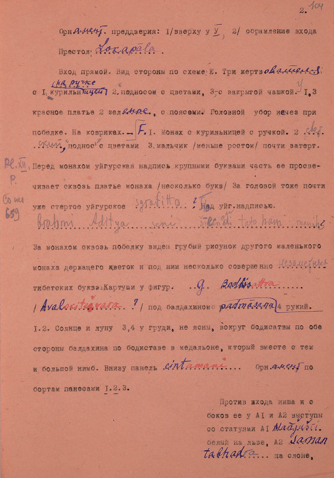 Ил. 3. Образец машинописного текста «Описания пещер Чан-фо-дуна близ Дунь-хуана» (пещера № 6) (СПбФ АРАН. Ф. 208. Оп. 1. Д. 175. Л. 104) © Санкт-Петербургский филиал Архива РАН