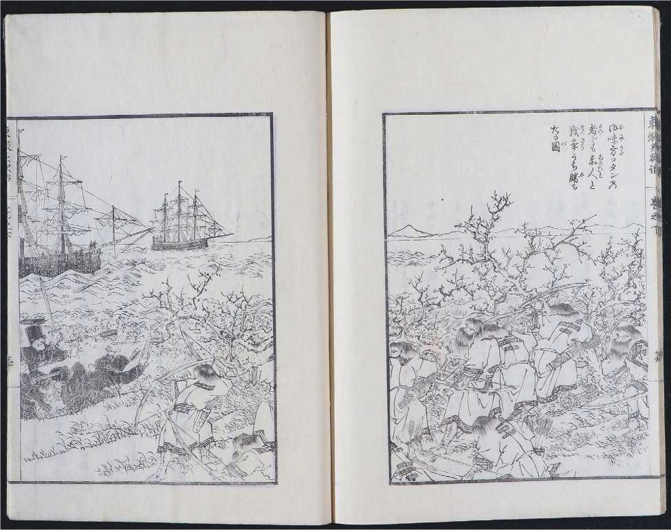 Ил. 2. Изображение вооружённого конфликта во время визита российской экспедиции Н.А. Хвостова и Г.И. Давыдова на Итуруп в 1807 г. Подпись гласит: «Жители дружественных посёлков (айны) сражаются с “красными людьми” (русскими)». Рисунок из японского ксилографа 1861 г. Источник: Институт восточных рукописей РАН