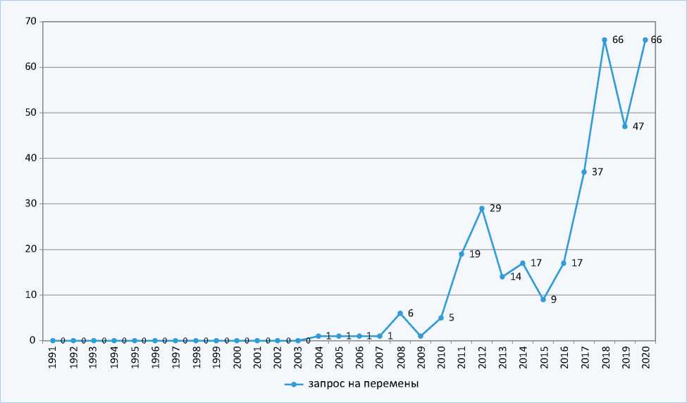 2. Fig. 1. Dynamics of the number of publications in Russian media from the Top 297 using the term “request for change”, 1991–2020. Compiled according to Medialogy data (https://www.mlg.ru)