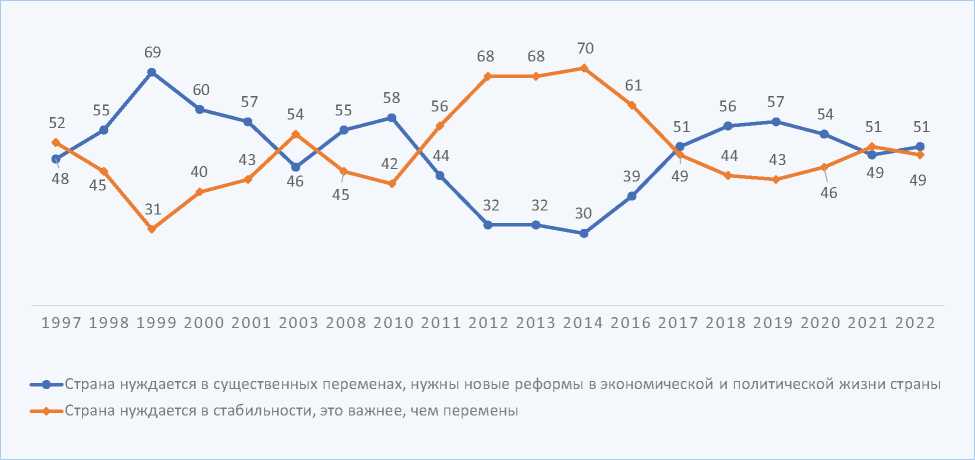 Рис. 2. Динамика отношения россиян к стабильности и переменам, 1997–2022 гг., % респондентов. Составлено по данным общероссийских репрезентативных социологических опросов Института социологии ФНИСЦ РАН