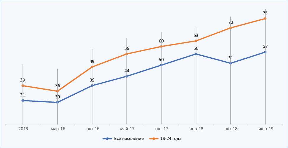 Рис. 3. Динамика ориентаций россиян на перемены, новые экономические и политические реформы в стране среди всего населения и в группе молодёжи от 18 до 24 лет, 2013–2019 гг., %