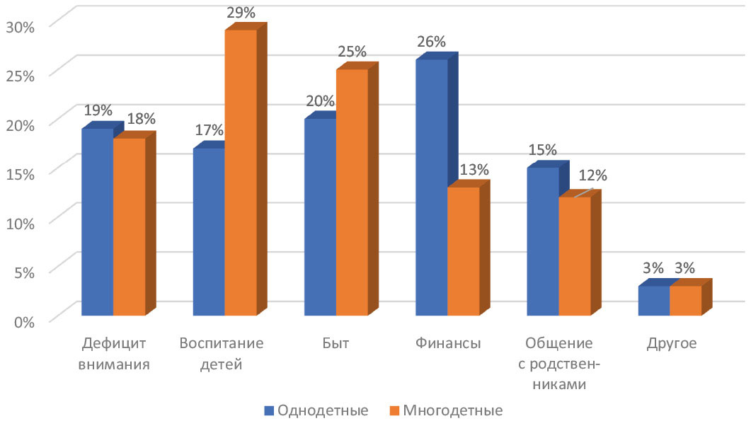 ¡ в основе супружеских конфликтов в однодетных и многодетных семьях лежат разные причины: так, на первое место в однодетных семьях выходят финансовые проблемы, а в многодетных семьях возникновение супружеских конфликтов связано с воспитанием детей и устройством быта;