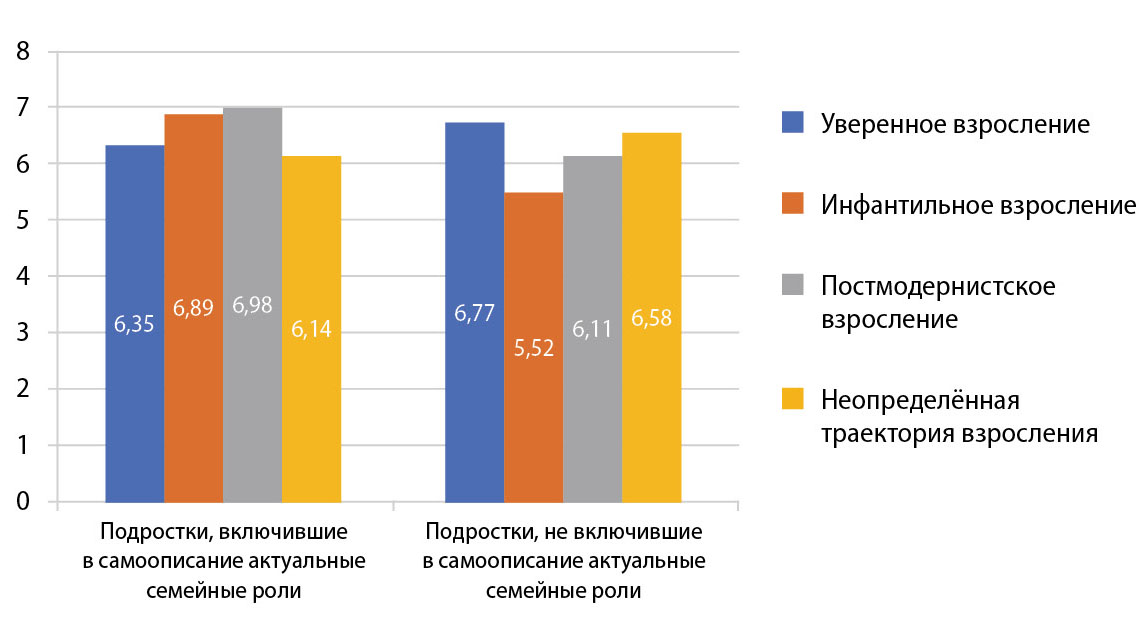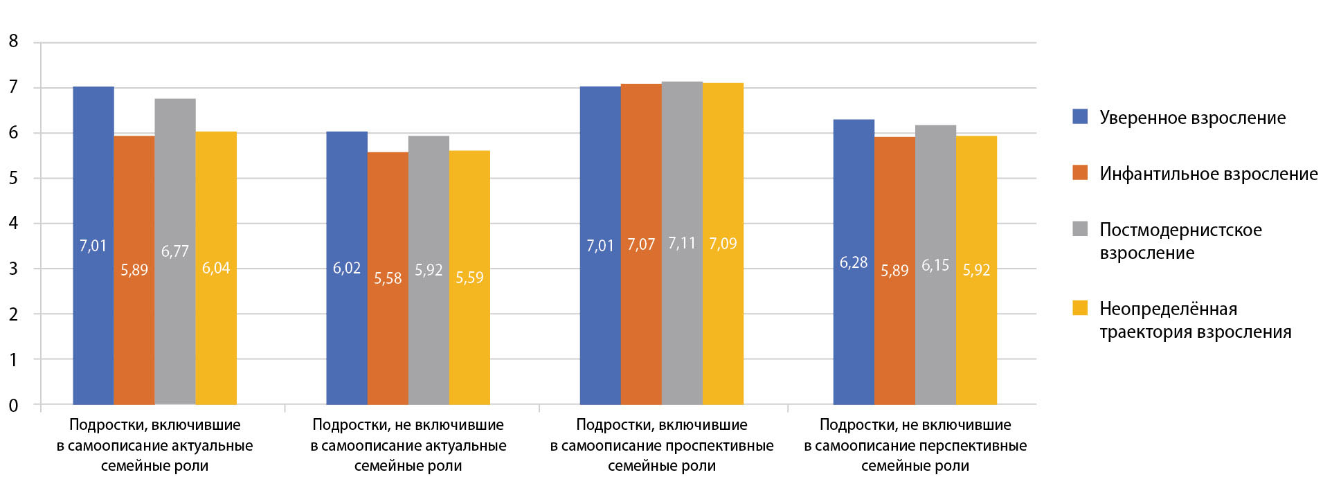 Согласно полученным результатам, актуальные семейные роли встречаются в самоописаниях 39,3% опрошенных подростков. При этом в подгруппе, демонстрирующей инфантильное взросление, частота упоминания этих ролей в среднем в полтора раза выше, чем в остальных (уверенное взросление — 34,3%, постмодернистское взросление — 43,7%, неопределённая траектория взросления — 39,2%), и составляет 52,3%. Будущие семейные роли (супружеские, родительские) подростки включали в самоописания значительно реже — в 4,3% случаев. Причём чаще других их упоминали подростки с уверенным взрослением (11,1%), реже — подростки с неопределённой траекторией взросления (1,4%), подростки с инфантильной и постмодернистской траекториями взросления занимают промежуточное положение (4,7% и 6,3% соответственно).