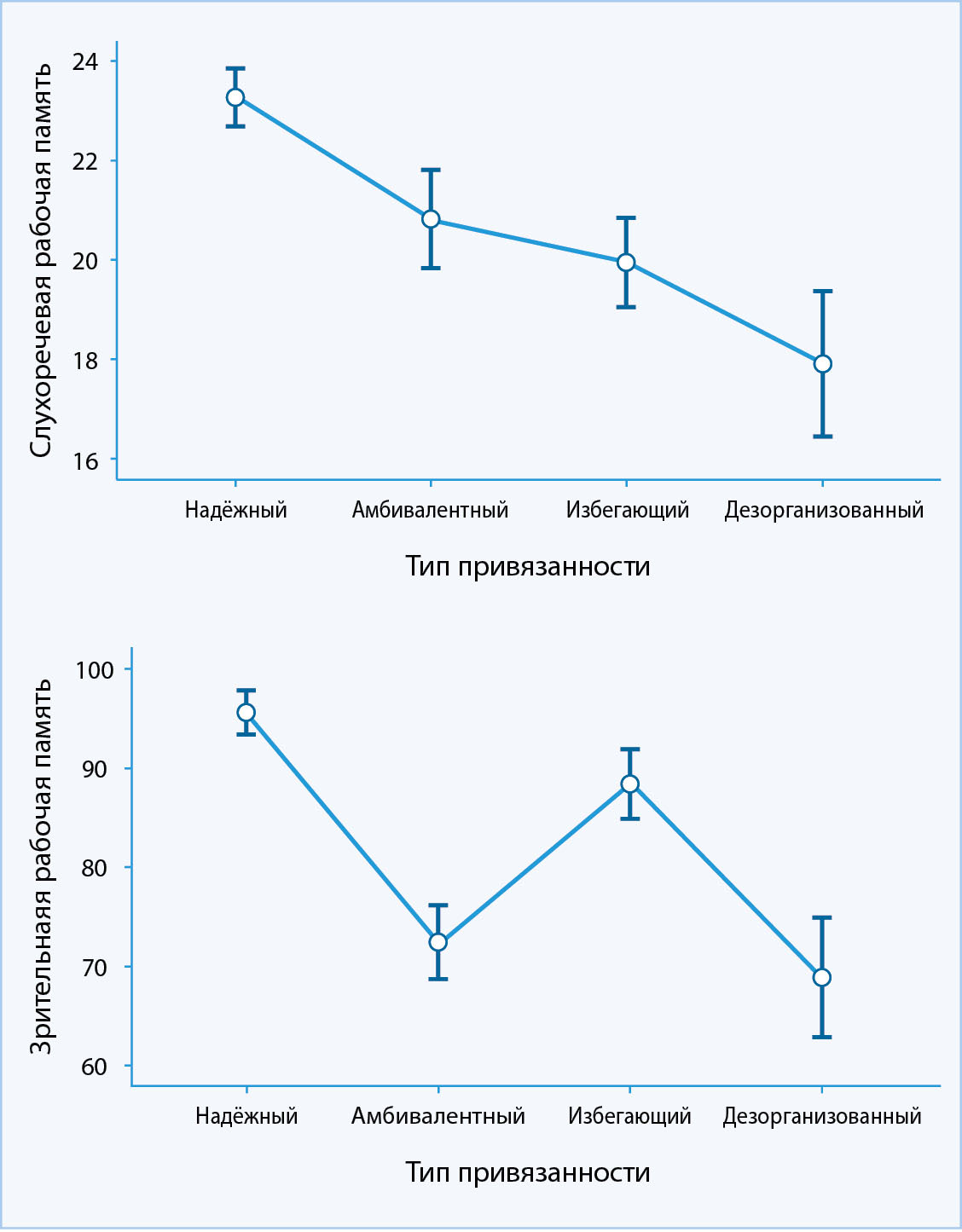 У детей с тревожно-амбивалентным типом привязанности к матери значимо выше оценки слухоречевой рабочей памяти и значимо ниже оценки зрительной рабочей памяти, чем у детей с тревожно-избегающим типом привязанности к матери. Кроме того, дети с тревожно-амбивалентным типом привязанности к матери тратят значимо больше времени и допускают значимо меньше ошибок в заданиях на когнитивное торможение, чем дети с тревожно-избегающим типом привязанности к матери.