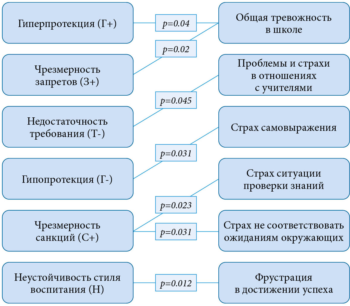 Обратившись к рисунку, можно увидеть значимые связи между различными нарушениями стиля воспитания и показателями школьной тревожности у подростков.