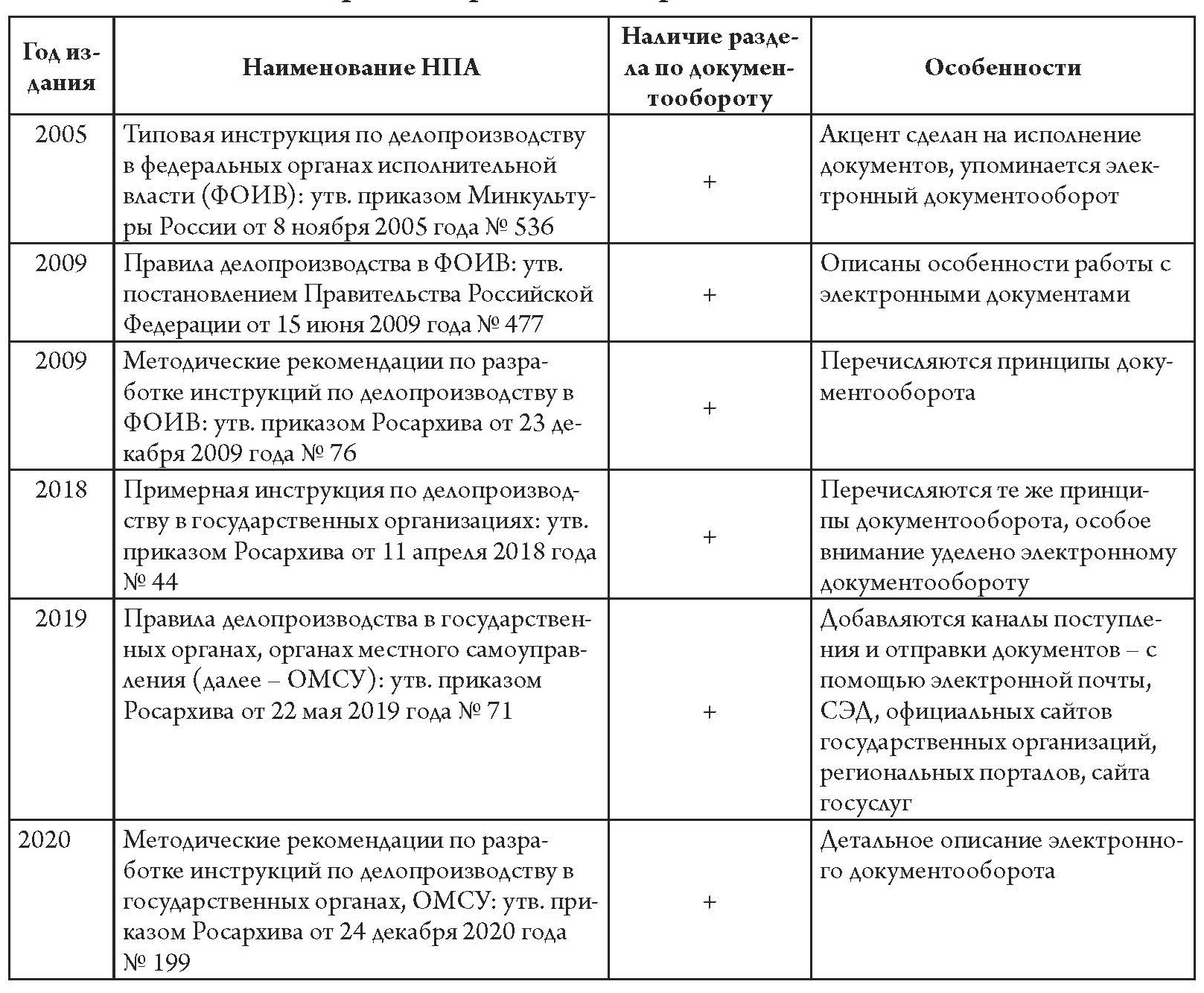 Итак, рассмотрев актуальные НПА по делопроизводству, можно сформулировать, что благодаря цифровизации появились новые НПА, направленные на упорядочивание документов и операций с ними посредством применения ИТ. Практически во всех разделах в современных актах описываются особенности работы с электронными документами. В большей степени существенно нового в правилах организации документооборота в приведенных документах нет, за исключением регламентации функционирования СЭД и электронного документооборота.