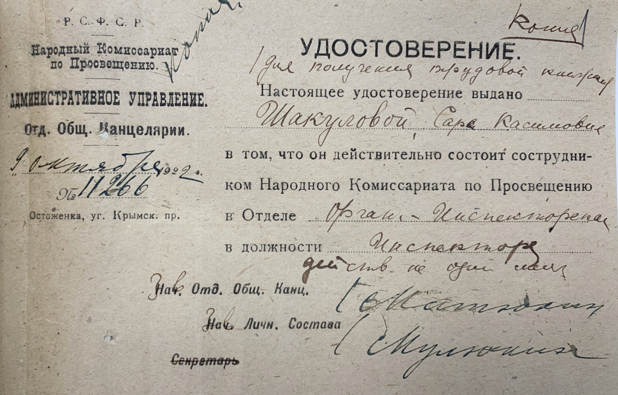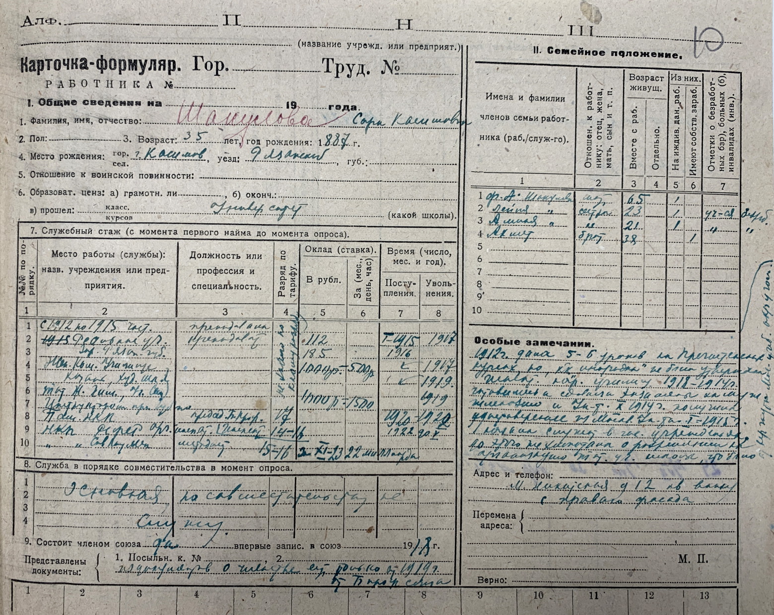 Карточка-формуляр (ГА РФ. Ф. А–2306. Оп. 63. Д. 15. Л. 10) представляет собой типографский бланк. Документ не датирован, но судя по его содержанию, подписи работодателя, он заполнен 15 ноября 1923 г. На момент его заполнения С. Шакулова работала в системе Наркомпроса. Из карточки мы также узнаем, что Сара Касымовна уже с 1918 г. состояла членом союза профессиональных работников, хотя, как она сама отмечала, подтвердить это документально может только с 1919 г. на основе удостоверения от Бюро учительского союза.