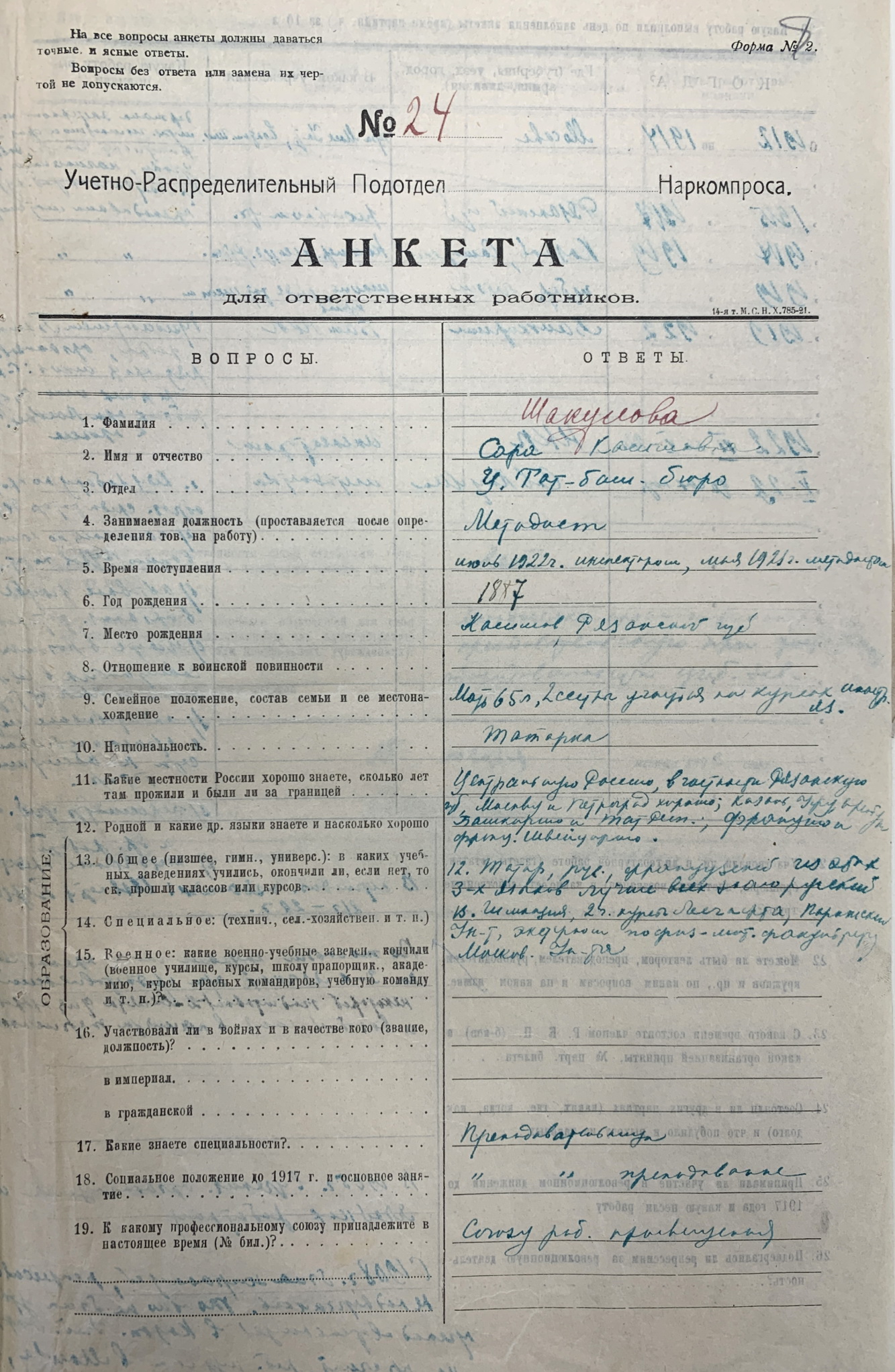 Типографский бланк анкеты, специально разработанный для ответственных работников Учетно-распределительного подотдела Наркомата просвещения РСФСР, включал 30 пунктов, охватывающих разные аспекты из биографии заполнявшего анкету работника – от личных биографических данных, занятий в дореволюционный период, до сведений, не предусмотренных анкетой. Существенной характеристикой документа является помета: «На все вопросы анкеты должны даваться точные и ясные ответы. Вопросы без ответа или замена их чертой не допускаются» (ГА РФ. Ф. А–2306. Оп. 63. Д. 15. Л. 8).