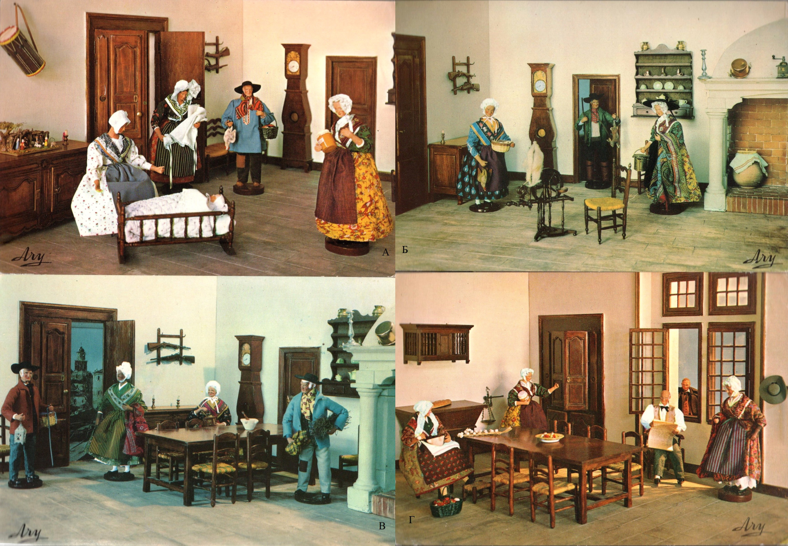 Рис. 2. Открытки из серии «La Provence d’autrefois» («Прованс прошлых лет»). Цв. фотооткрытки. Marseille: Éd. TARDY, б.г.; 10,5х15 см; без полей. Подписаны по-французски. Почтовые штемпели, даты отсутствуют. А – Молодой матери подносят подарки; В – «Папаша» собирается выйти из дома. Б – Слуги спрашивают хозяйку, что приготовить к обеду; Г – в ожидании обеда «папаша» читает газету.