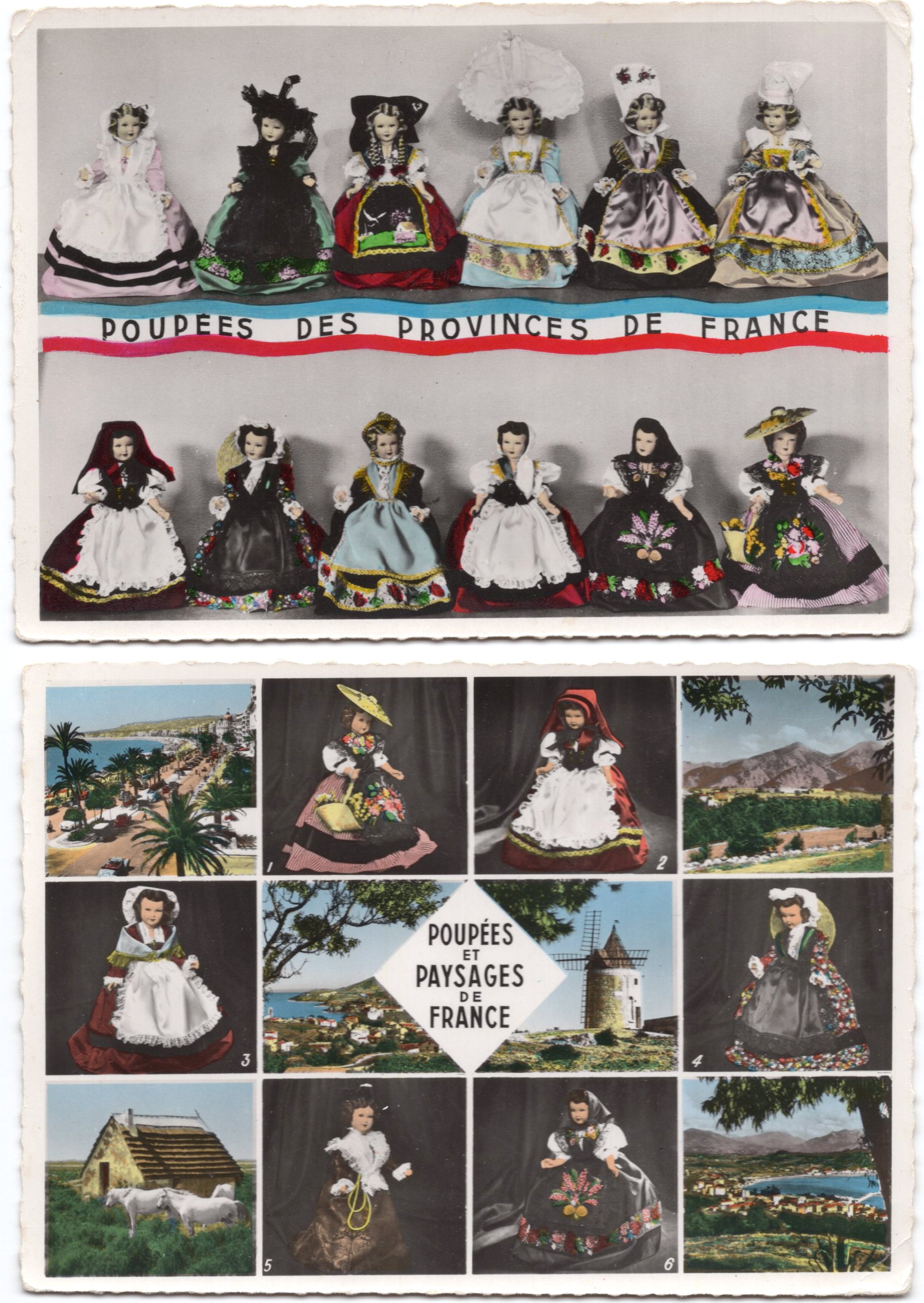 Рис. 3. Групповые открытки из серий «Poupées des provinces de Françe» и «Poupées et paisages de Françe». Цв. фотооткрытки. Nice: Éd. S.E.P.T., б.г.; 10,5х15 см, поля белые, края с волнистым обрезом. Вверху – чистая, внизу – подписанная, прошла почту, но штамп нечитаемый.