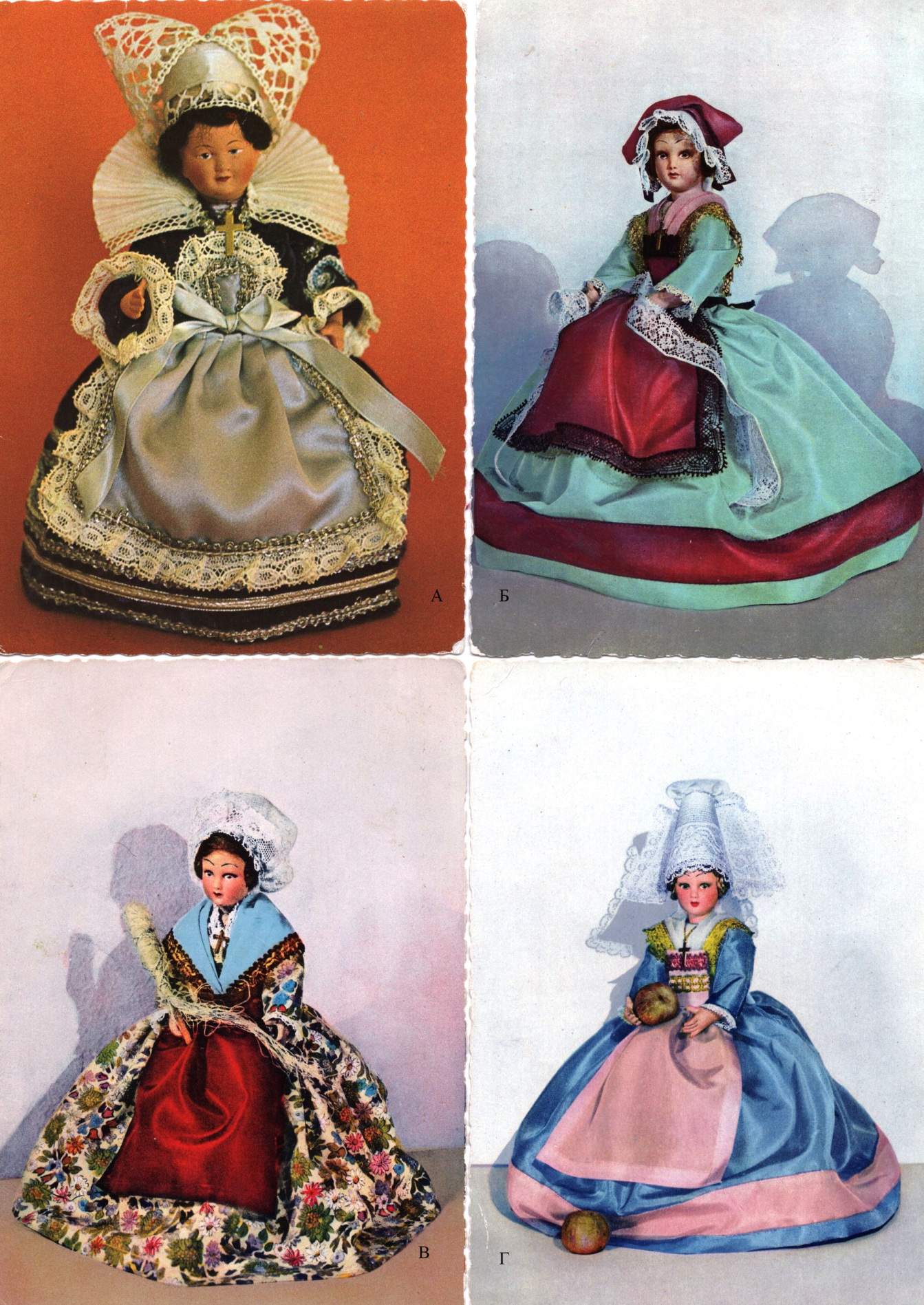 Рис. 1. А – Кукла в костюме Савойи. 1924 г. Фотооткрытка. Б.м., б.г. [1924]; 13,8х9 см; Б – Кукла в костюме Бургундии. Цв. фотооткрытка. Modéle de la Société Cadette. Cannes: Éd. Francesca, б.г.; 15х10,5 см; на обороте карандашом написана дата: 16.3.60; В – Кукла в костюме Тулузы. Цв. фотооткрытка. Toulouse: Éd. d’Art Labouche frères, б.г.; 15х10,5 см; прошла почту 24.08.1978; Г – Кукла в костюме Шампани. Цв. фотооткрытка. Blois: Éd. ESTEE, б.г.; 15х10,5 см; отправлена из Реймса 21.4.74.