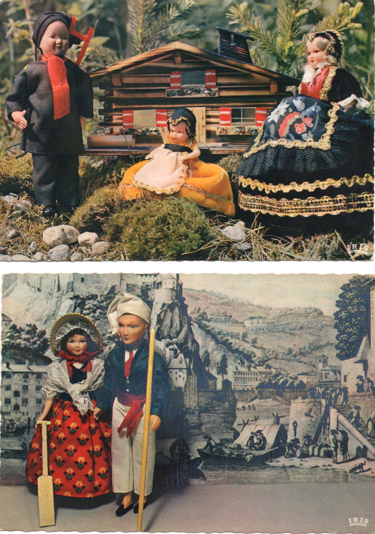 После Второй мировой войны вместе с восстановлением европейских памятников и развитием туризма большое распространение получили французские куклы в региональных[2] костюмах. Они производились частными предприятиями и стали образцовой сувенирной продукцией (Odin, Odin, 1999). Фирмы «Petitcollins», «Le Minor», «Poupée Yolande», «MAGALI», «Mabel», «Bella» славились высоким качеством исполнения фигурок в национальных костюмах, над исполнением которых нередко трудились профессиональные портные, кружевницы, стилисты. Изыскания в области традиционного костюма, делавшиеся во время разработки новой модели, вносили серьезный вклад в изучение данного вопроса (Libouban, 2011: 22, 34, 38 et al.). Рынок наполнился высококачественными изделиями, рассчитанными на покупателя разного возраста и кошелька, а также на туристов. Это отразилось и в количестве, и качестве открыток.