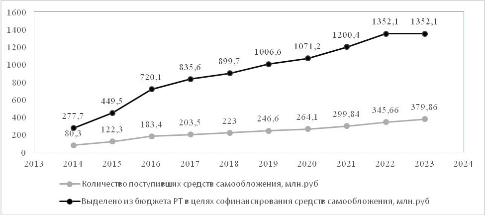 Наблюдается положительная динамика и по объемам поступавших средств за счет самообложения граждан. В 2014 г. было собрано 80,3 млн руб., в 2023 г. сумма увеличилась почти в пять раз и достигла 379,86 млн руб. Всего с 2014 по 2023 гг. сельчане собрали 2 млрд 361,89 млн руб. Увеличивалась и сумма софинансирования из бюджета Татарстана. В 2014 г. она составляла 277,7 млн руб., в 2023 г. – 1352,1 млн руб. (рис. 1). За последние 10 лет из бюджета Республики Татарстан было выделено 9 млрд 165,1 млн руб.