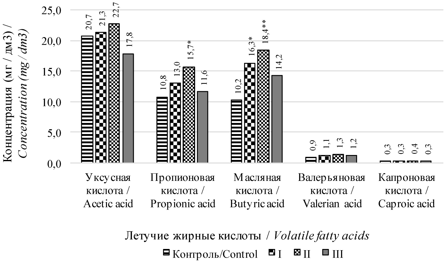 Уровень летучих жирных кислот (ЛЖК) в содержимом рубца устанавливали методом газовой хроматографии с пламенно-ионизационном детектированием на хроматографе газовом «Кристаллюкс-4000М (СКБ Хроматек, Россия), формы азота – по ГОСТ 26180-84, ГОСТ 13496.4-2019.