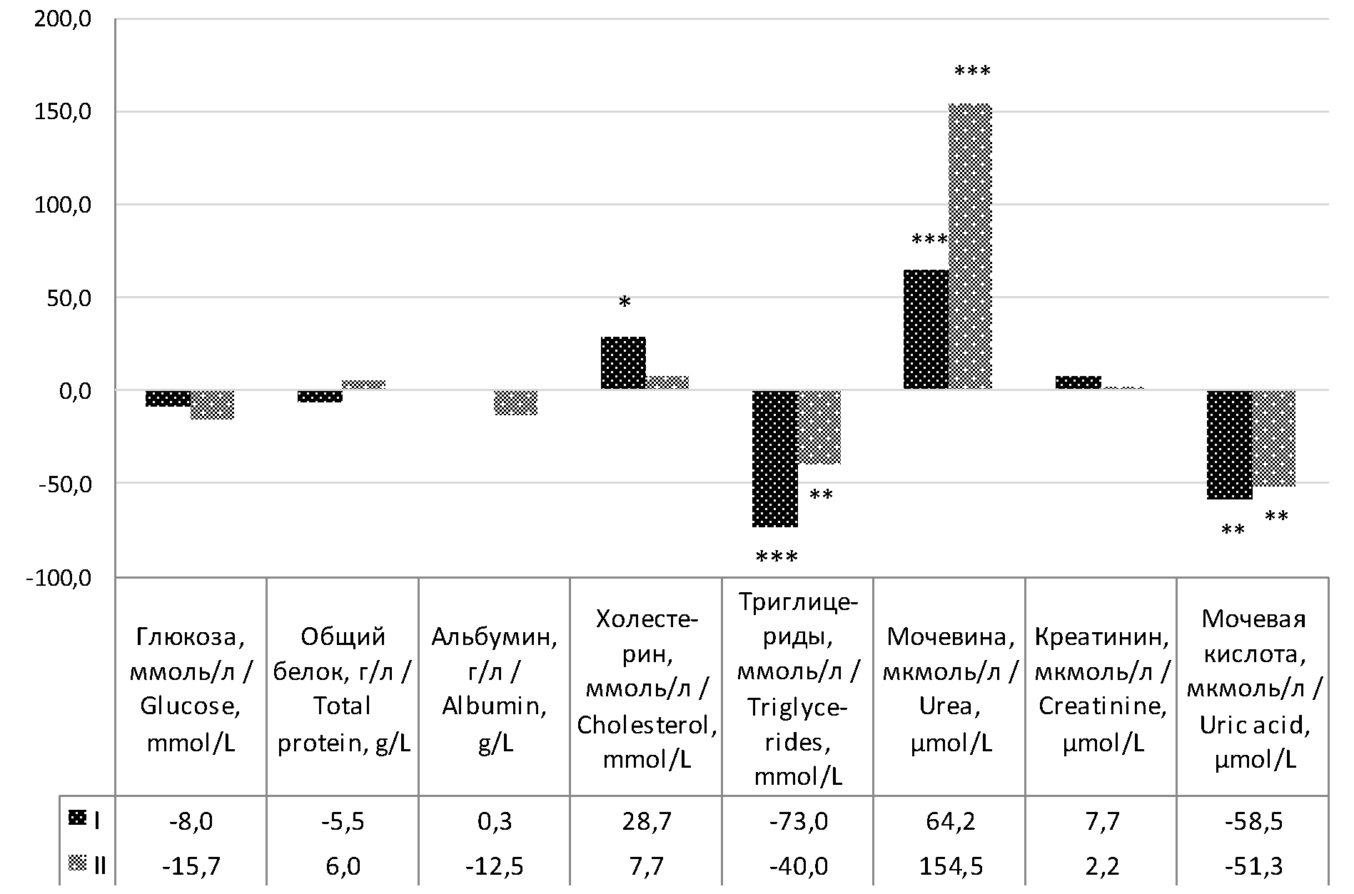 Креатинин, образующийся в результате распада белка в организме, идёт на обновление тканей печени через мышечную систему, в которой он фосфорилируется до креатинфосфата, и в дальнейшем происходит окисление и образование самого креатинина (Assis JR, 2021). В нашем эксперименте уровень креатинина возрастал в обеих группах на 7,7 % и 2,2 %.