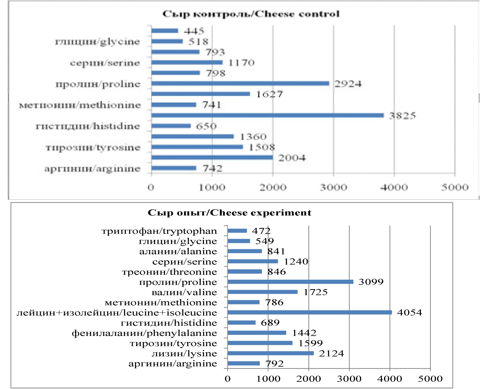 Оценка аминокислотного состава позволила более точно сравнить показатели контрольного и опытного образцов, при котором выявлено превосходство по большей сбалансированности в сыре опытной группы.