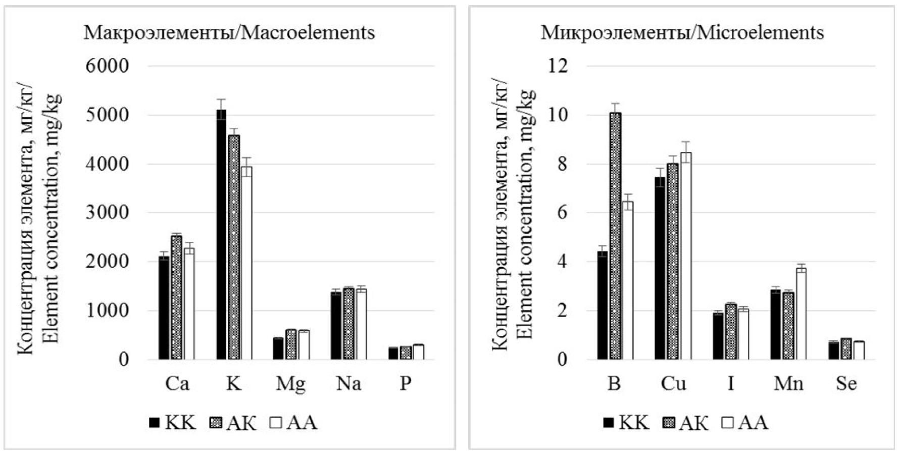 Молочные коровы с генотипом АК имели более высокие концентрации селена, способствующего укреплению иммунной системы животных, на 13,23 % по сравнению с генотипом АА (p=0,03) и 17,5 % –в сравнении с группой КК. Также у коров с генотипом АК было отмечено более высокое содержание кальция, необходимого для формирования костной ткани и обеспечения правильной лактации, на 10,36 % и йода, обеспечивающего нормальное функционирование щитовидной железы, на 10,24 % в сравнении с группой АА и на 18,93 % и 18,63 % соответственно –относительно группы КК.