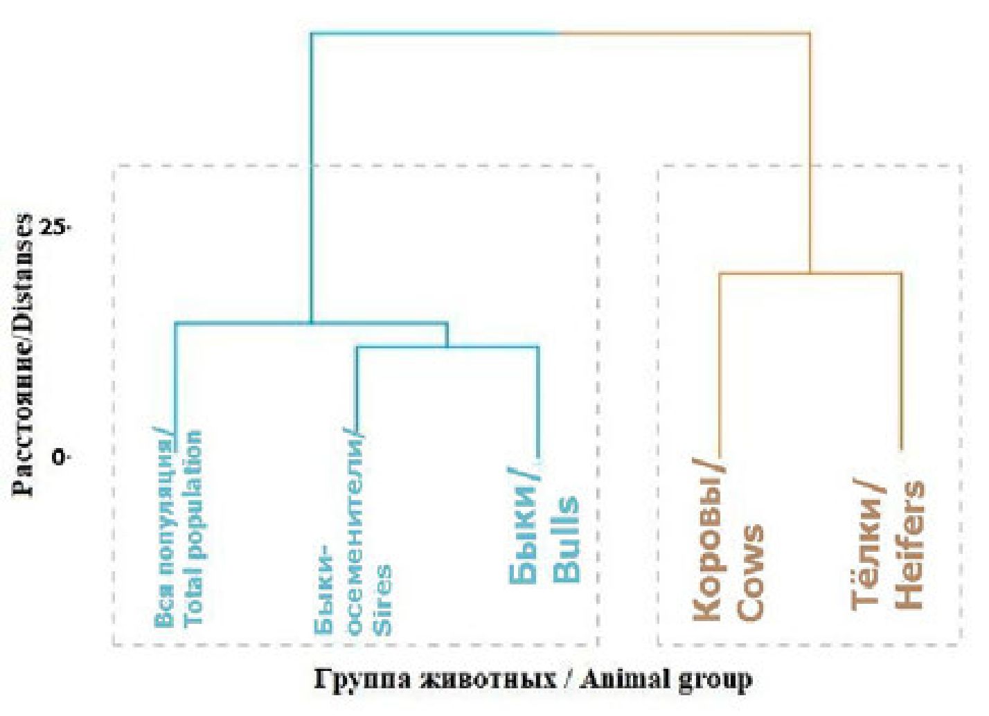 Первый кластер объединяет всю популяцию, быков-осеменителей и быков, свидетельствуя о высокой степени сходства в структуре рангов пропущенных записей в этих группах (дистанция=2). Это означает, что распределение пропусков по разным предкам для быков и быков-осеменителей практически идентично распределению соответствующих пропусков для всей совокупности животных. Такой результат объясняется тем, что быки и быки-осеменители составляют значительную часть популяции, происхождение которых играет ключевую роль в процессе подбора родительских пар. Второй кластер включает коров и тёлок, что указывает на отличия в структуре рангов пропущенных генеалогических записей для этих групп по сравнению с быками и всей популяцией. Данное различие может быть обусловлено особенностями ведения генеалогического учёта для разных половозрастных групп животных. Информация о происхождении коров и тёлок заполняется менее тщательно относительно таковой о происхождении быков. Необходимо отметить значительное расстояние между двумя кластерами на дендрограмме (дистанция=5.5), которое подтверждает существенные различия в структуре пропущенных генеалогических записей. Проведённый анализ был основан на рангах, а не на абсолютных частотах, что позволило снизить влияние выбросов и различий в общем числе пропусков для разных групп животных, фокусируясь на сравнительном анализе структуры пропусков.