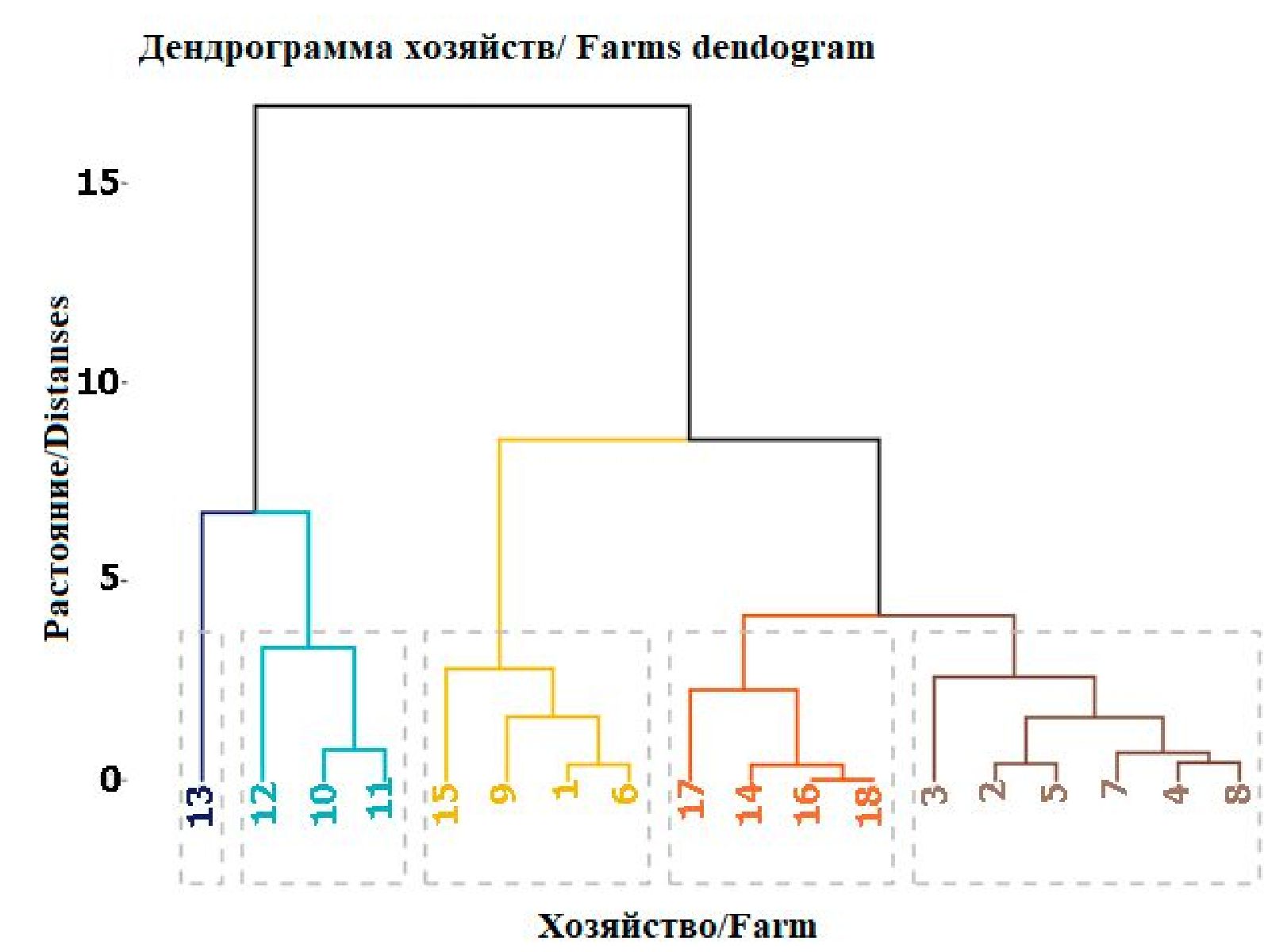 Дендрограмма, построенная с использованием метрики Чебышева и метода полной связи, иллюстрирует структуру сходства/различия 18 племенных хозяйств по проценту пропущенных генеалогических записей для быков, коров и телок (рис. 3).