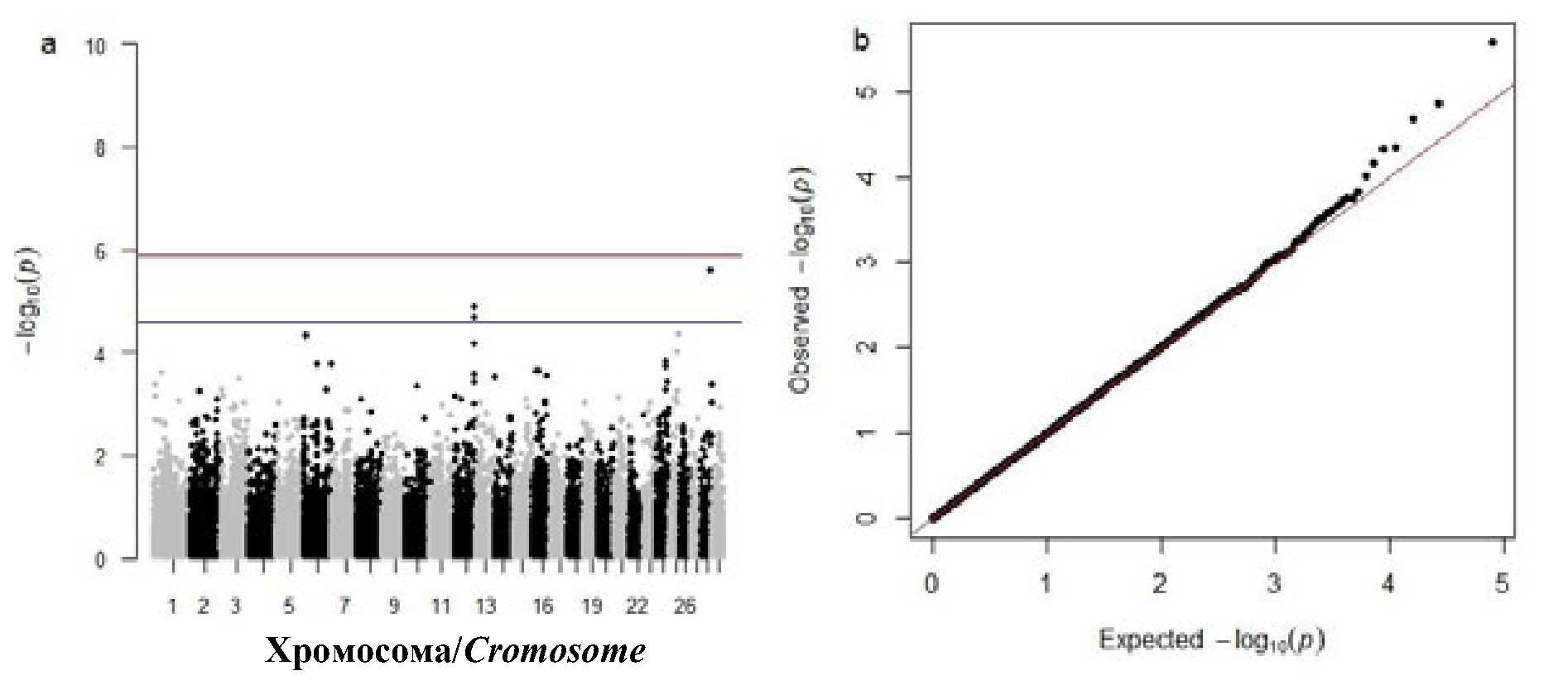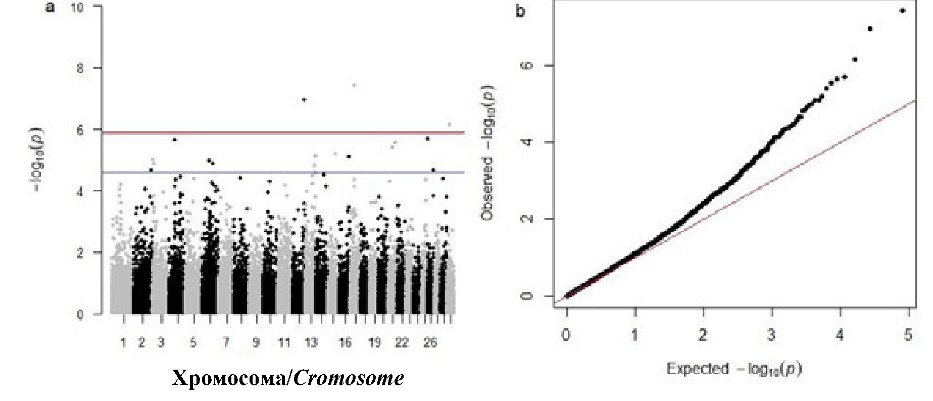Рисунок 2. График Манхеттан для признака «ДКСК» (а). Пороговое значение для всего генома (красная линия) соответствует поправке Бонферрони. Графики квантиль-квантиль (QQ) отображают отрицательные логарифмы ожидаемых значений p (ось X) и наблюдаемых значений p (ось Y) (b).