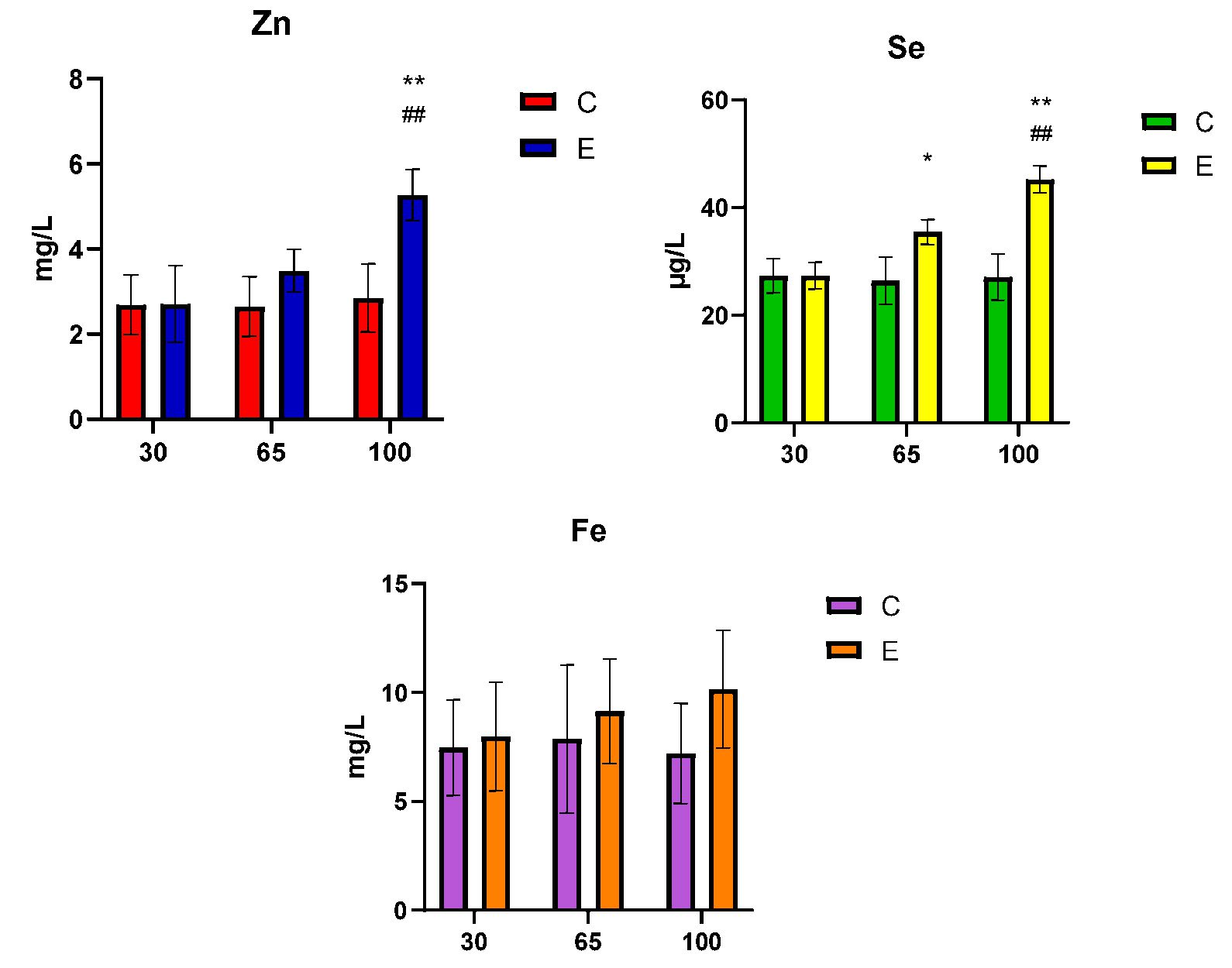 Zinc is an essential trace element that supports immune function and is involved in numerous enzymatic processes. According to Raynal-Ljutovac K et al. (2008b), the concentration of zinc in cow milk can vary among different breeds, with some breeds exhibiting higher levels due to genetic factors and dietary intake. In this aim, Proskira N et al. (2016) presented a Zn concentration of 3.7 µg/dm3 in Jersey cow’s milk, and Pilarczyk R et al. (2013) a concentration of 3.02 µg/mL in Simmental and 3.27 µg/mL in Holstein-Friesian cows, concentration that is above that we found in our study in control cows but lower that we observed in cows supplemented with chelated minerals in the day 100 of lactation period.