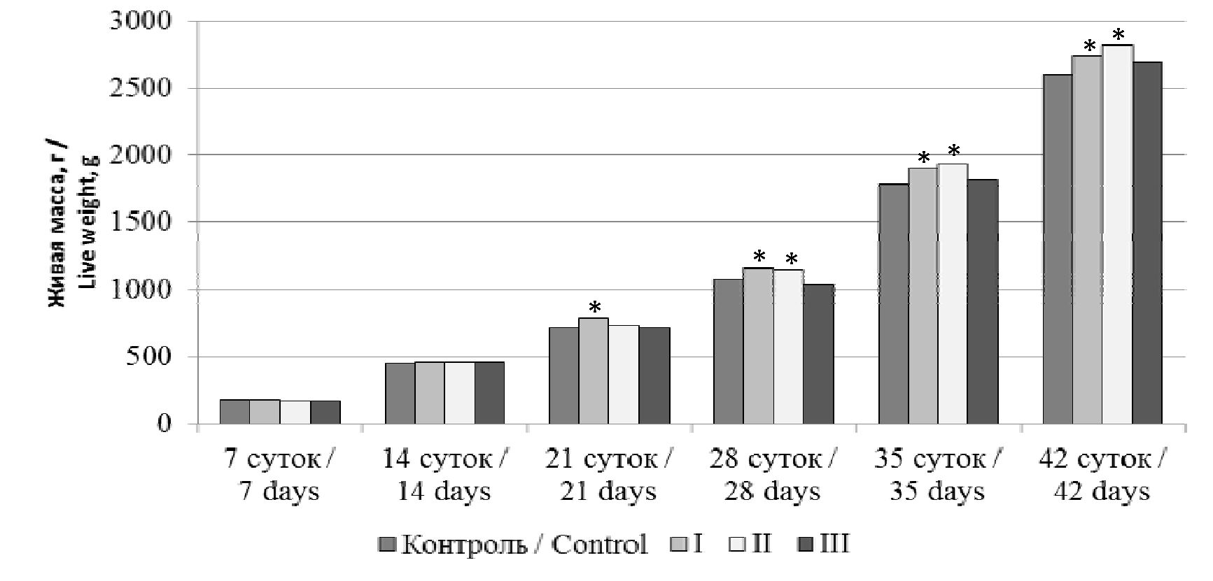 Кормление цыплят-бройлеров рационом с фитобиотическими препаратами положительно сказалось на формировании живой массы птиц (рис. 1).