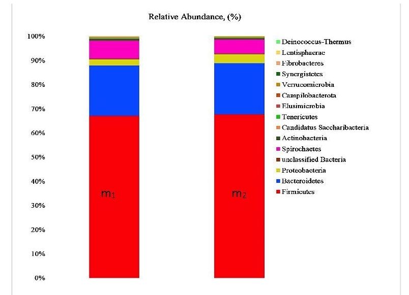 Figure 1. Relative abundance of microorganisms in the intestinal content at the phylum level for animals with live weights m1 and m2, %