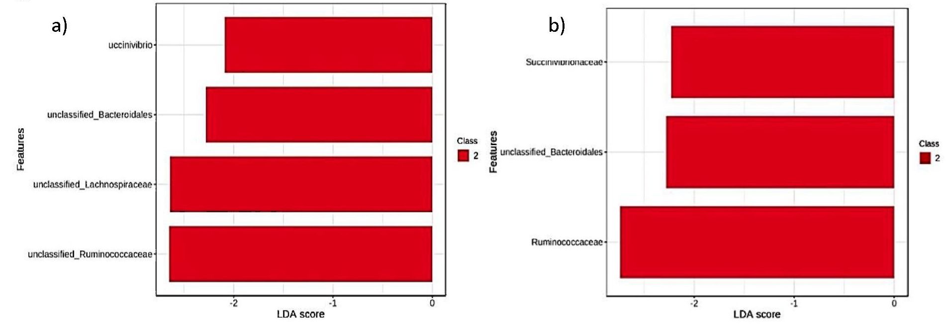 Для определения более точного нахождения отличий в таксономической структуре кишечного содержимого на уровне рода в группах m1 и m2 был использован метод поиска различий Linear Discriminant Analysis Effect Size (LEfSe). Анализ выявил самые важные различия по семействам (рис. 3а) и родам (рис. 3b) для группы тёлок с живой массой m2. Также установлено, у группы с живой массой m1 доля бактерий в кишечном содержимом, представленная родами Clostridium sensu stricto, Clostridium XlVa, Treponema, была выше в среднем на 20,0 %, чем у группы m2. В группе m2 доля родов с более высокими значениями OTU, относящихся к родам Mediterraneibacter, Phascolarctobacterium, Succinivibrio, Monoglobus и unclassified Bacteroidales, была больше, чем в группе m1.