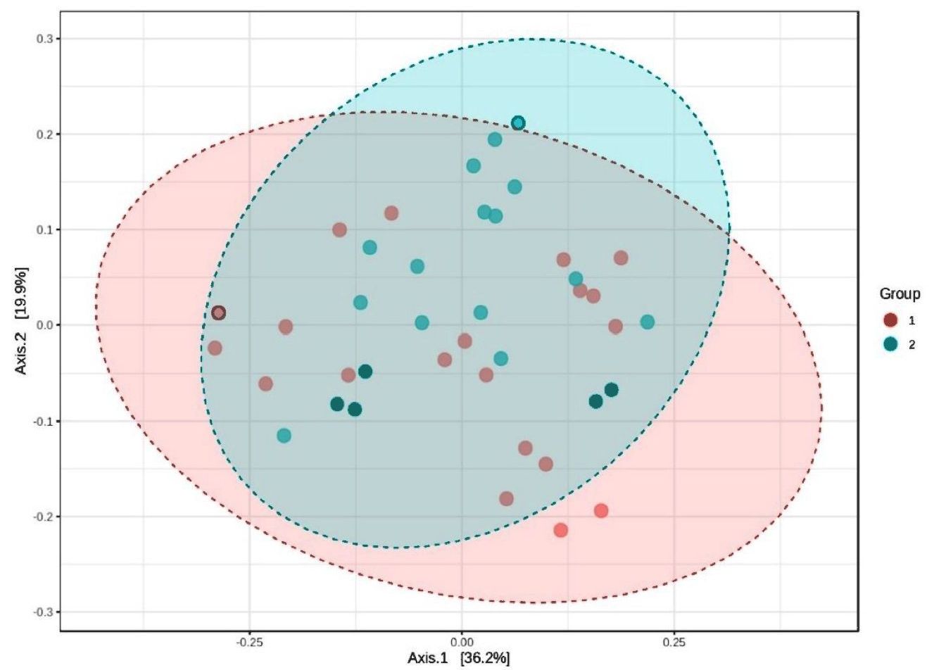 Figure 4. Analysis (PCoA) of the beta diversity of the bacterial community, intestinal contents, in accordance with the Bray-Curtis index, at the phylum level, in figure: 1 – m1, 2 – m2.