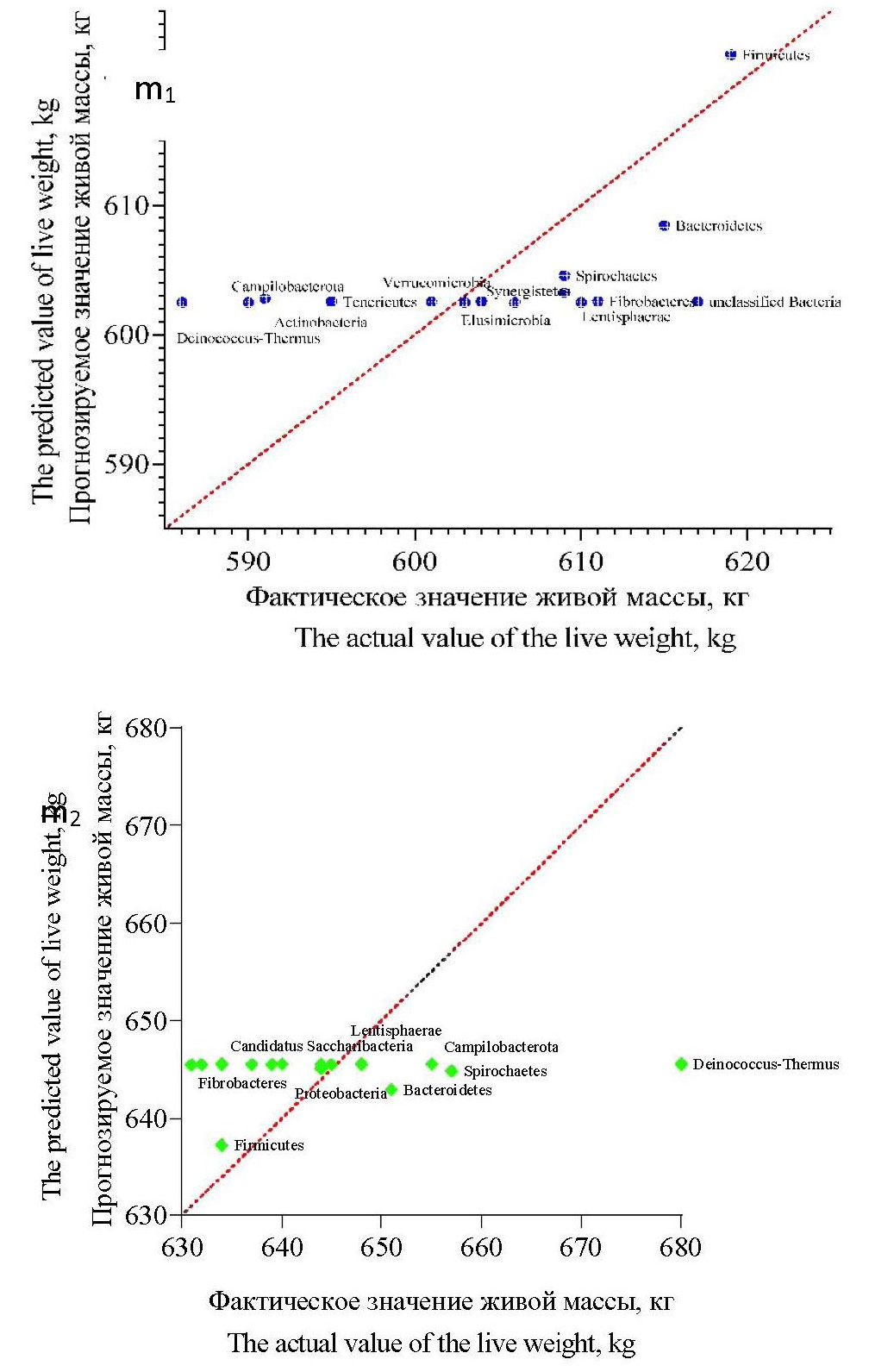 Оценка связи или изменения хозяйственных признаков, живой массы тела исследуемых животных с бактериальным сообществом кишечника имела общий вид уравнения линейной регрессии зависимости живой массы (y) и количества OTUs. В группе m1 имеет вид y(m1)=600,7+0,0022*OTUs, R2=0,98 отображает точность построения математической модели и силу взаимосвязи между массой животного и значением OTUs, критерий Фишера был равен F=72,9 при значении P=0,091. В группе живой массы m2 общий вид уравнения линейной регрессии представлен y(m2)=611,3+0,0612*OTUs, R2=0,36, критерий Фишера – F=26,5 при значении P=9,36E-06. Данные коэффициенты указывают на положительную корреляционную связь между значением массы животного и генным банком содержимого кишечника (рис. 5).