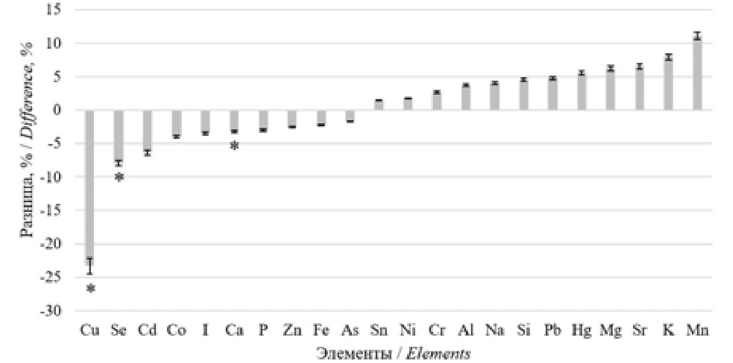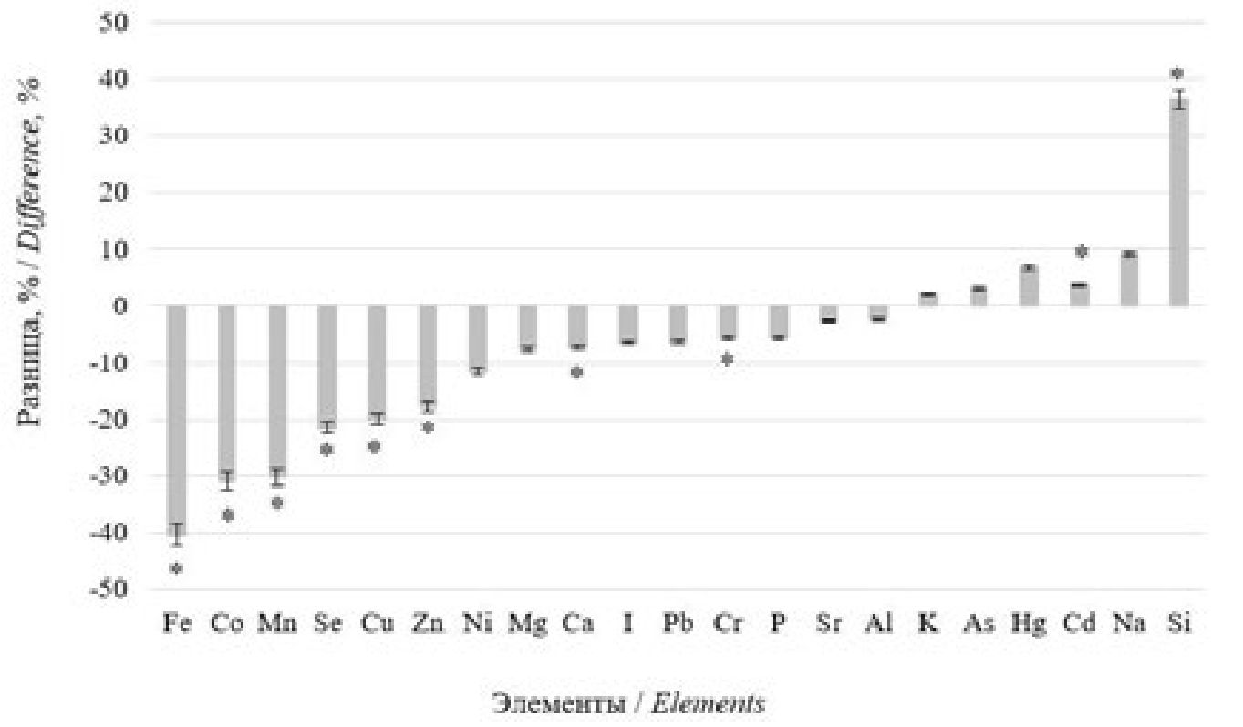 Figure 1. Difference in concentrations of chemical elements in the hair of cows of group II in comparison with group I