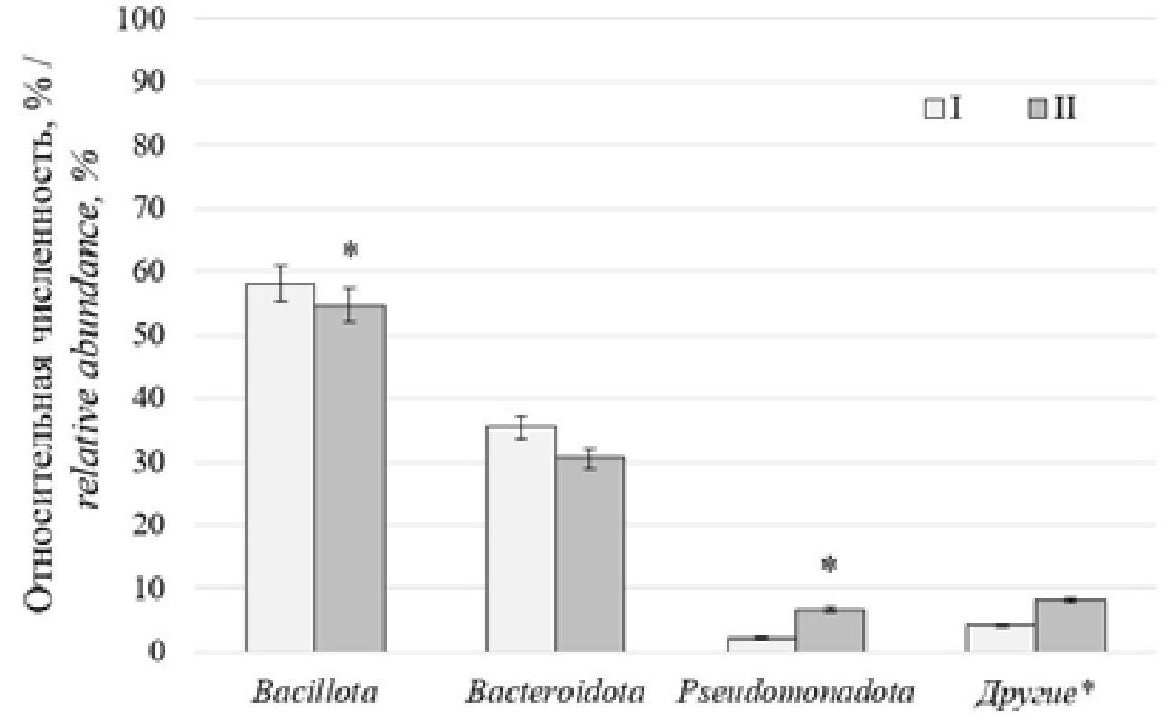 Исследование бактериального состава микробиома толстого кишечника коров исследуемых групп показало, что основная доля идентифицированных бактерий относится к филумам Bacteroidota (30,6-35,5 %) и Bacillota (54,7-58,2 %) (рис. 3). Минорной группой в микробиоме толстого кишечника являлись бактерии таксона Pseudomonadota (2,2-6,6 %) в обеих опытных группах.
