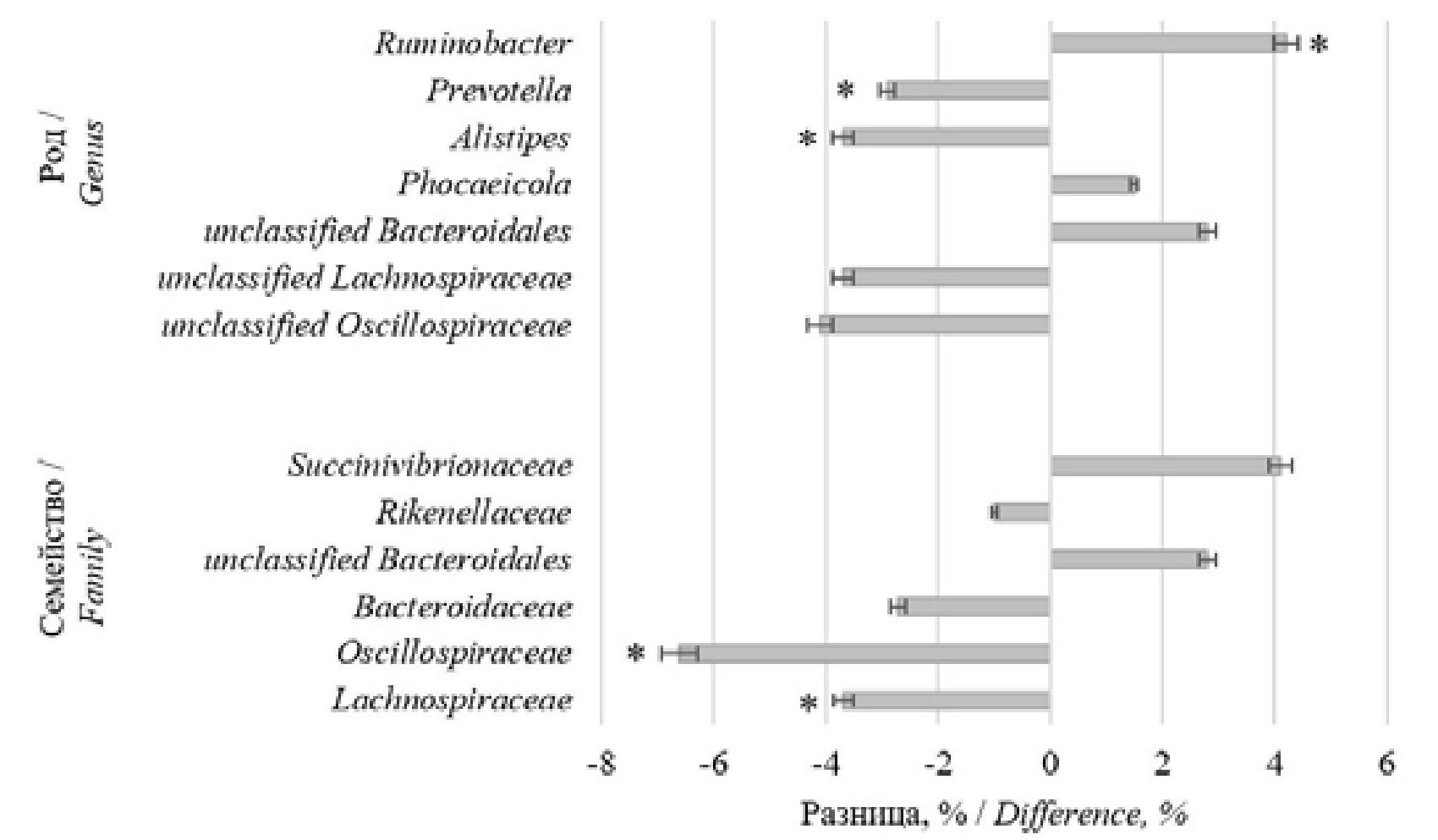 Значимые различия между таксономическими составами микробиомов толстого кишечника при сравнении II группы с I были отмечены на уровне семейств и родов (рис. 4). Во II группе в сравнении с I была выявлена более низкая доля бактерий семейств Lachnospiraceae (-3,68 %, Р≤0,05) и Oscillospiraceae (-6,6 %, Р≤0,05), р. Alistipes (-3,51 %, Р≤0,05) и р. Prevotella (-2,9 %, Р≤0,05). Также отмечено в микробиоме кишечника II группы, при сравнении с I, более низкая относительная численность unclassified Oscillospiraceae (-4,1 %, Р≤0,05) и unclassified Lachnospiraceae (-3,69 %, Р≤0,05). Наоборот, доля микроорганизмов Succinivibrionaceae (р. Ruminobacter) в микробиоме толстого кишечника коров II группы была выше чем в I группе на 4,2 % (Р≤0,05).