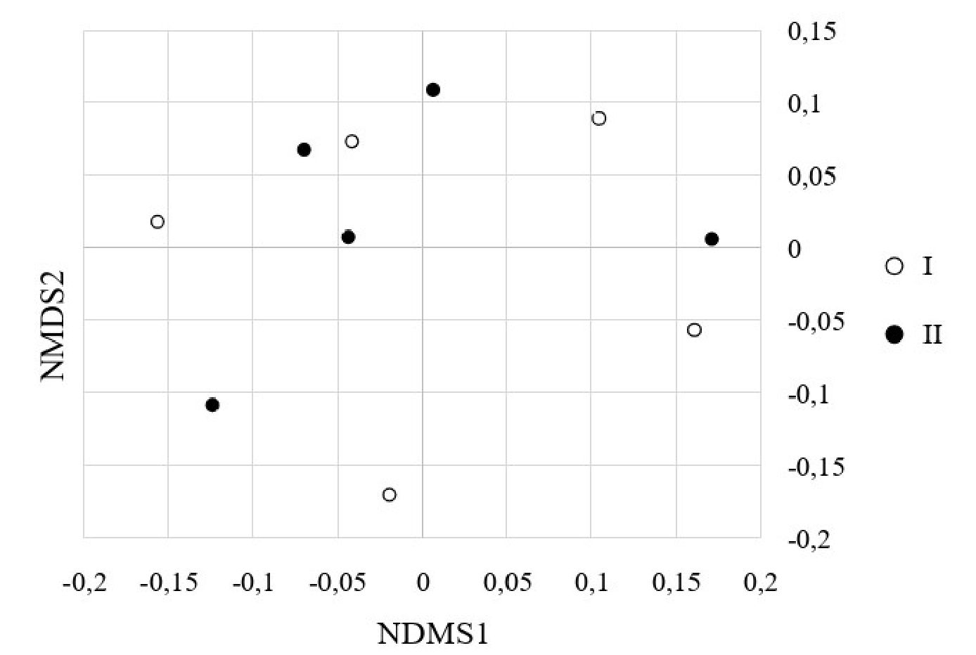Рисунок 5. Бета-разнообразие микробиоты толстого кишечника коров I и II групп