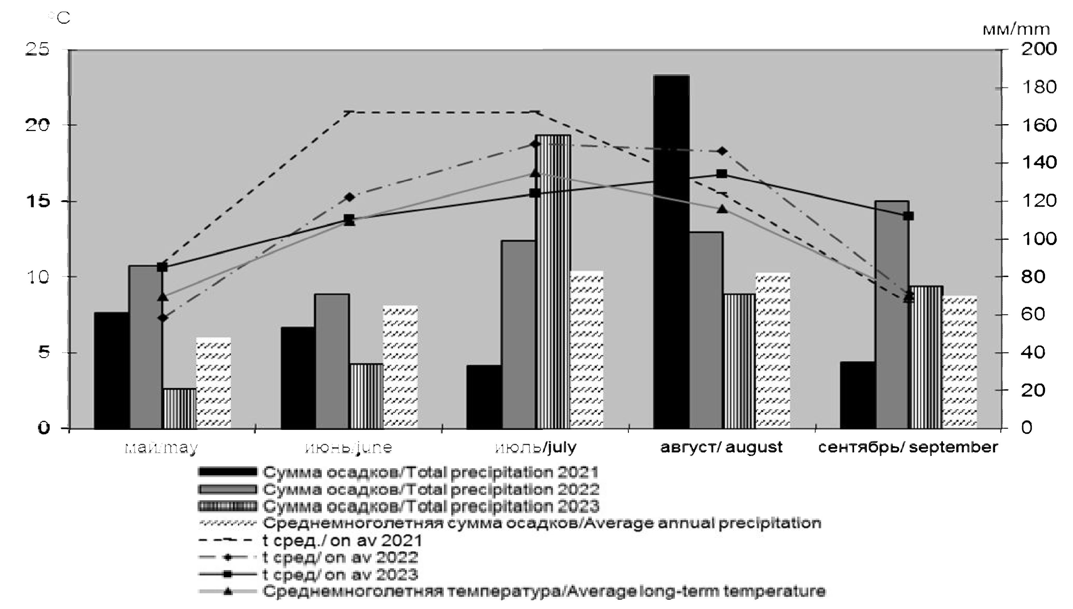 Полевые сезоны 2021-2023 гг. различались по тепло- и влагообеспеченности. Вегетационный период 2021 г. отмечен резким дефицитом влаги в июне и июле (на 12 и 55 мм меньше среднемноголетней), на фоне температуры, превышающей среднемноголетние на 7,2 и 4 ºС соответственно, характеризуя месяцы как очень засушливые, что оказало влияние на всходы и формирование урожая в первый год жизни травостоя. 17 августа проведено подкашивание сорной растительности. Укос проведён 23 сентября на его формирование потребовалось 79 дней, к этому времени была накоплена сумма активных температур выше 10 ºС – 1035 ºС. ГТК укоса составил 1,86.