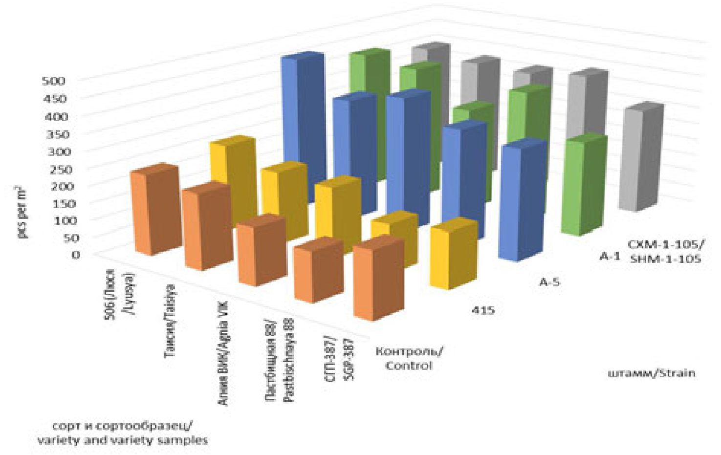 Недостаток влаги в июне и июле 2021 г. оказал влияние на всхожесть и образование побегов. В первый год жизни количество побегов варьировало от 120 шт./м2 сорт Агния ВИК в сочетании с производственным штаммом 415 до 336 шт./м2 сортообразец 506 (сорт Люся), обработанный штаммом А-1. Практически со всеми штаммами (кроме А-5), включая контрольный вариант, сорт Агния ВИК формировал минимальное количество побегов в 2021 году, от 120 до 184 шт./м2.