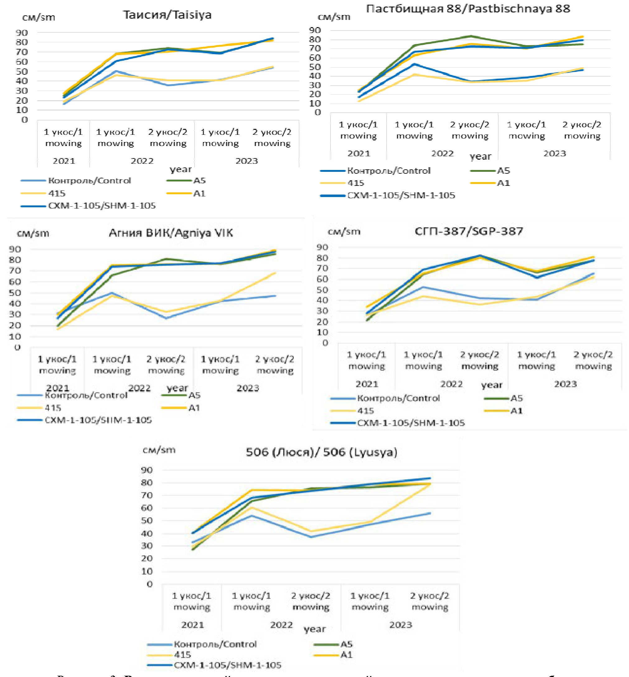 Скорость роста растений отражает конкурентоспособность трав в агроценозе (рис. 3). В 2021 году, в год посева трав, высота травостоев варьировала от 12,5 см (сорт Пастбищная 88+штамм 415) до 40,4 см (сортообразец 506 (сорт Люся)+штамм А-1). Инокуляция семян штаммом А-1 оказала положительное влияние на скорость роста растений в первый год жизни на всех изучаемых сортах люцерны и сортообразцах (кроме сорта Агния ВИК) – высота растений варьировала от 24,8 до 40,4 см.