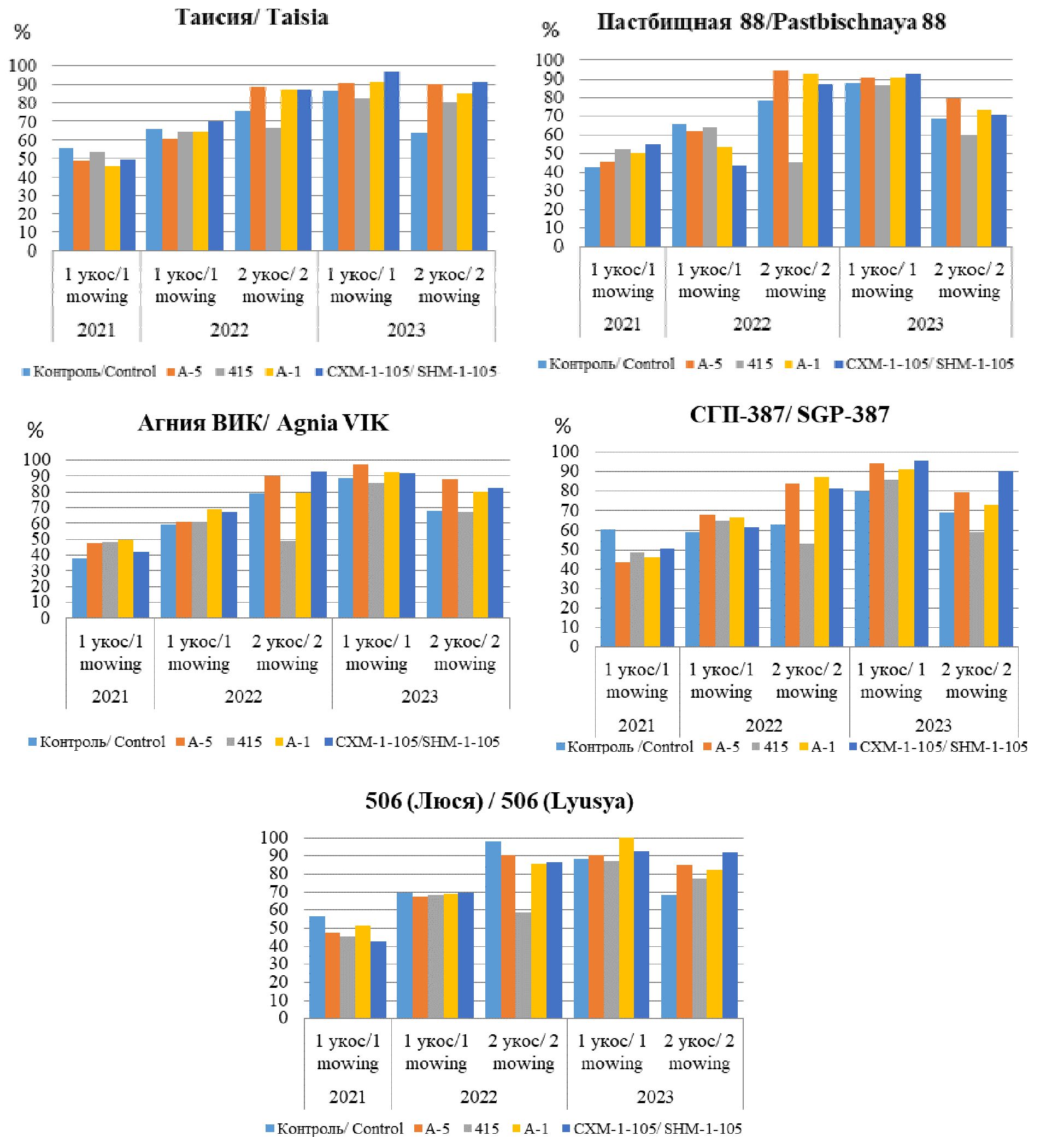 Формирование продуктивных травостоев невозможно без учёта урожайности (табл. 1). Планируемое использование фитоценозов – двуукосное, однако первый год жизни – не показательный, и травостой сформировал лишь один укос. В дальнейшем (2022-2023 гг.) наибольшую урожайность сухой массы обеспечили следующие сорто-микробные системы: сортообразец 506 (сорт Люся) и сорт Агния ВИК со штаммом СХМ-1-105 (7,45 и 7,25 т/га сухой массы соответственно), и эти же сорта при инокуляции семян штаммом А-1 – 7,17 и 7,23 т/га соответственно. Сорт Пастбищная 88, инокулированный штаммом А-5, также отличился высоким сбором сухой массы (7,22 т/га). Производственный штамм 415 не обеспечил существенных прибавок урожайности, которая варьировала в диапазоне 3,00-4,44 т/га, практически на уровне контрольных, не инокулированных вариантов (3,03-3,49 т/га).