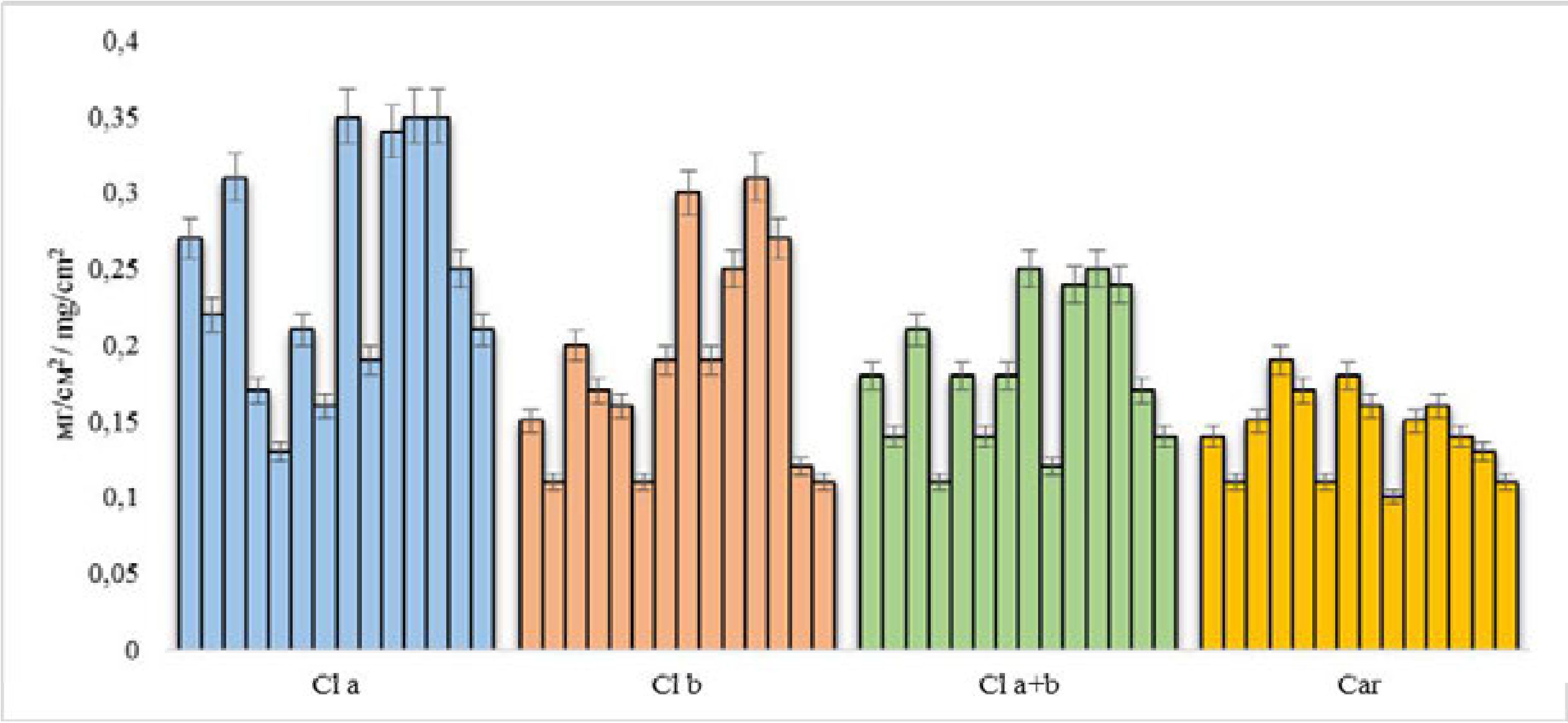 Figure 1. Concentration ranges of chlorophyll and carotenoids in the upper leaves of spring barley at the time of tillering, mg/cm2
