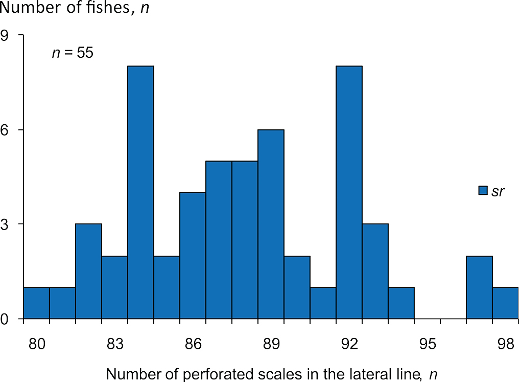 В уловах из НТВ в основном присутствовала малотычинковая форма сига (далее sr) с числом sp.br. от 16 до 28 (20.7± 0.10) (Рис. 3). На протяжении всего периода исследования было выловлено только две особи сига с числом sp.br. 32 и 39, которых можно отнести к среднетычинковой форме (mr) (Рис. 3). Визуальный анализ внешнего строения сигов из НТВ при вылове и обработке материала, а также изучение полученных изображений рыб выборок выявил некоторые различия в морфологии головы и тела отдельных особей sr формы сига. Так в НТВ встречались: