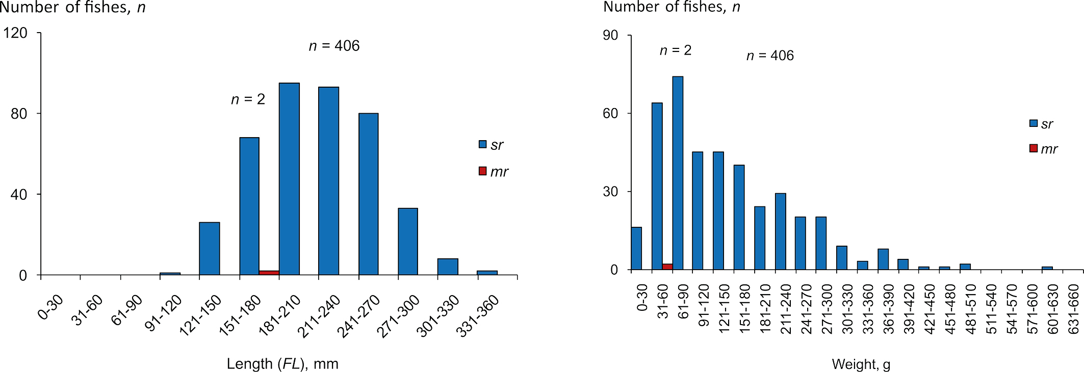 The catches from the NTR mainly contained the sparsely rakered (hereinafter sr) whitefish morph with the number of sp.br. from 16 to 28 (20.7 ± 0.10) (Fig. 3).Throughout the entire study period, only two whitefish individuals were caught with the number of sp.br. 32 and 39, which can be classified as the medium rakered (mr) whitefish morph (Fig. 3).Visual analysis of the external structure of whitefish from the NTR during catching and processing of the material, as well as the study of the resulting images of fish samples, revealed some differences in the morphology of the head and body of individual specimens of the sr whitefish morph. Thus, the NTR met: