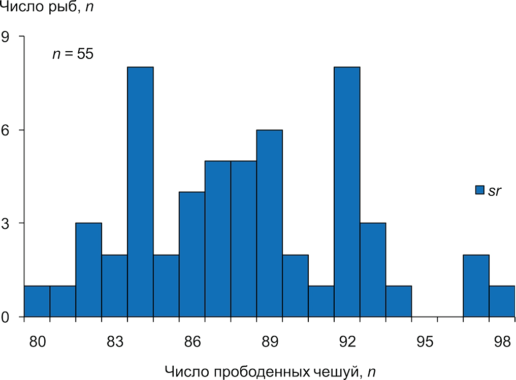 Рис. 3. Распределение европейского сига по числу тычинок на первой жаберной дуге, n в Нижнетуломском водохранилище (бассейн р. Тулома), 2018-2022 гг. Sr – малотычинковая форма сига, mr – среднетычинковая форма сига