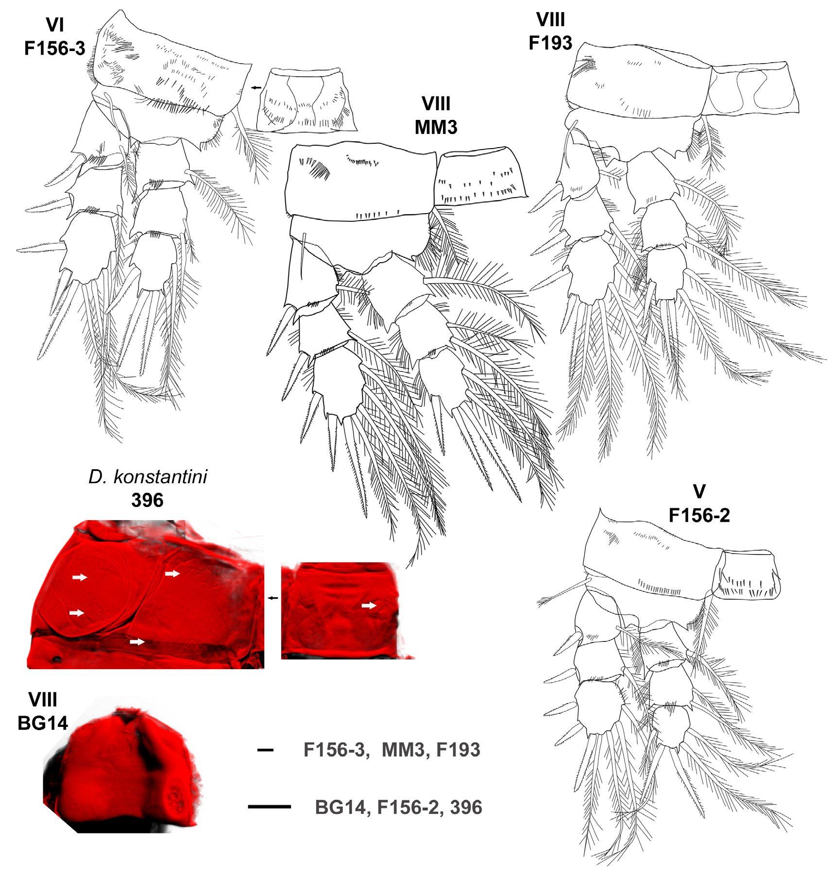 Особи D. konstantini и F156-2 (V) генетически близки и отличаются от versutus-группы в вооружении Enp3P4. Они имеют два шипа и три щетинки. У особи F156-2 (V) соединительная пластинка P4 несет два ряда длинных шипов. Базиподит A2 особи F156-2 (V) орнаментирован двумя рядами шипов и группой мелких шипиков на каудальной поверхности, двумя рядами тонких шипов на проксимальной части фронтальной поверхности и тонкими шипами вдоль обеих боковых поверхностей и вооружен двумя голыми щетинками и экзоподальной щетинкой с сетулами (Рис. 5, 6). Второй эндоподит антенны несет семь щетинок.