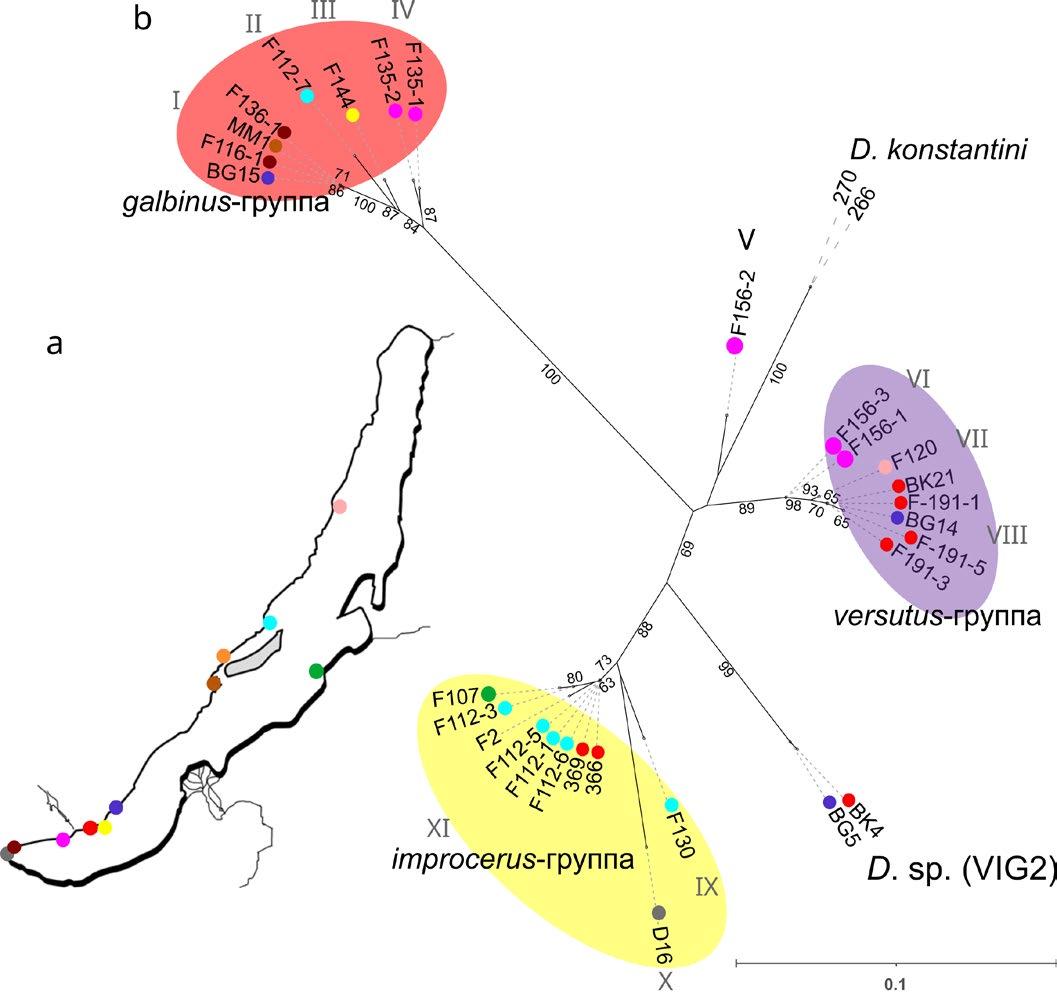 Представители galbinus-, improcerus-, и versutus-групп распространены симпатрически (Рис. 1a). Особи D. konstantini, D. sp. (VIG2), VIII линии versutus-группы и XI линии improcerus-группы были собраны в районе пос. Большие Коты в разное время. Представители D. sp. (VIG2), VIII, I генетических линий были собраны в одной пробе в районе пос. Большое Голоустное (Таблица 1). Также в одной пробы мы находили представителей versutus-группы (F156-1, F156-3 - VI) и генетически близкой им V линии (F156-2); особей galbinus-группы (F112-7 - II) и improcerus-группы (XI) или представителей galbinus-группы (MM1 – I) и versutus-группы (MM2, MM3 - VIII).