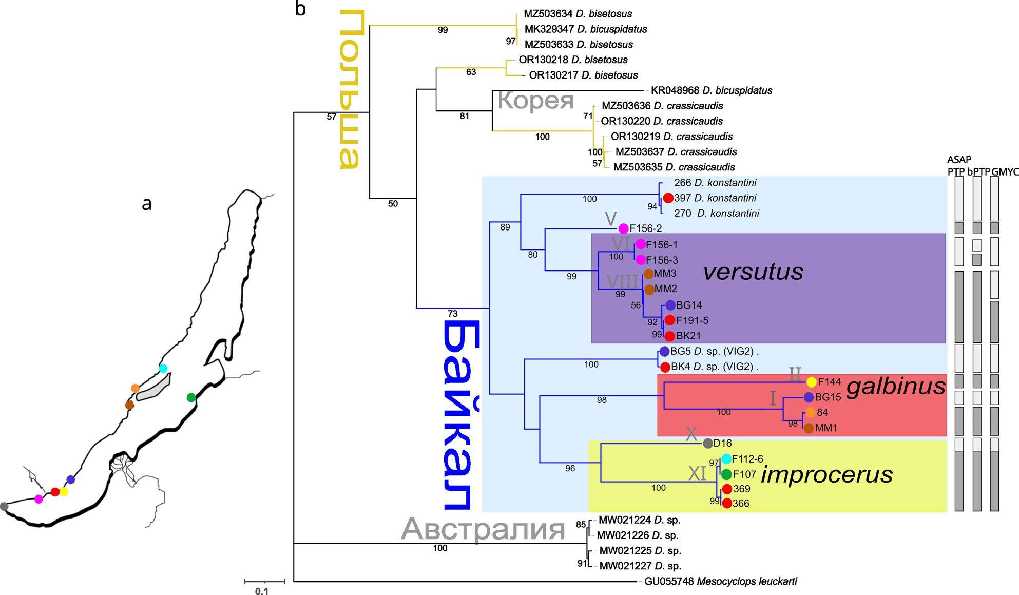 Большая часть особей из improcerus-группы, принадлежащие XI генетической линии, и часть особей galbinus-группы, принадлежащие I генетической линии, отличались от описаний D. improcerus и D. galbinus только меньшей пропорцией цефалоторокаса и остальных торакальных сегментов или более длиной антеннулой. Так как эти признаки состоят из телескопических сегментов, возможно, разная фиксация и хранение особей могли повлиять на точность их измерения, что также отмечается для Cyclopoida (Huys and Boxshall, 1991; Karanovic and Krajicek, 2012). Кроме того, мы вычисляли соотношение длины цефалоторакса к сумме длин 2-5 сегментов торакса, но не уверенны, что Г.Ф. Мазепова измеряла также, возможно, она использовала только длины 2-4 сегментов. Таким образом, возможно именно XI и I генетической линии представляют D. improcerus и D. galbinus. Полученные генетические и морфологические данные могут стать основой для интегративного переописания этих видов в будущем. Это особенно важно в условиях отсутствия типового материал для эндемичных циклопов D. improcerus, D. versutus и D. galbinus из озера Байкал.