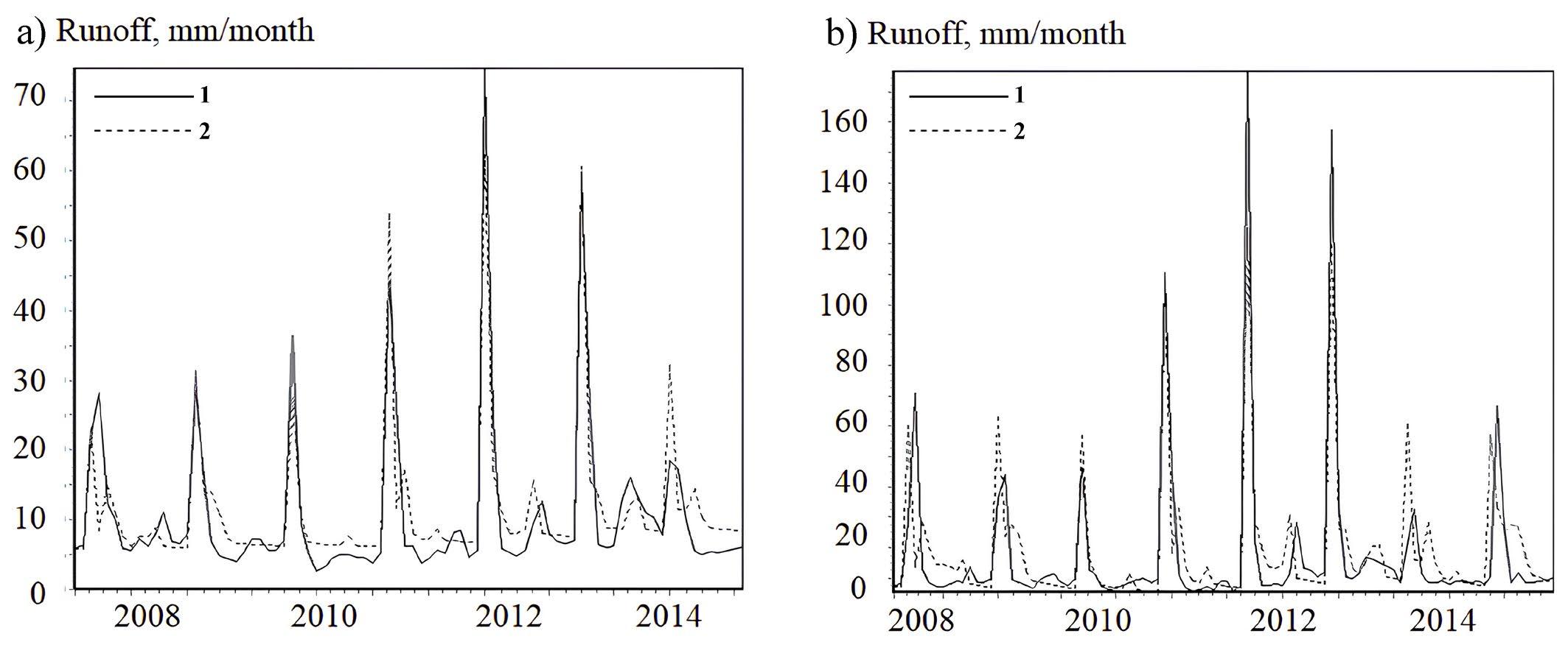 Fig.2. The observed (1) and calculated (2) average monthly runoff layers from the Kudma (a) and Linda (b) catchments.