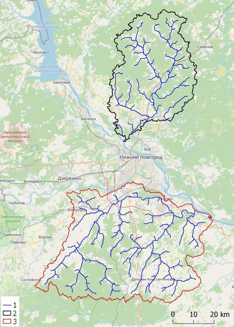 Рис.1. Схема расположение пилотных водосборов рек Кудьмы и Линды: 1 – гидрографическая сеть, 2 – водосбор р. Линды, 3 – водосбор р. Кудьмы.